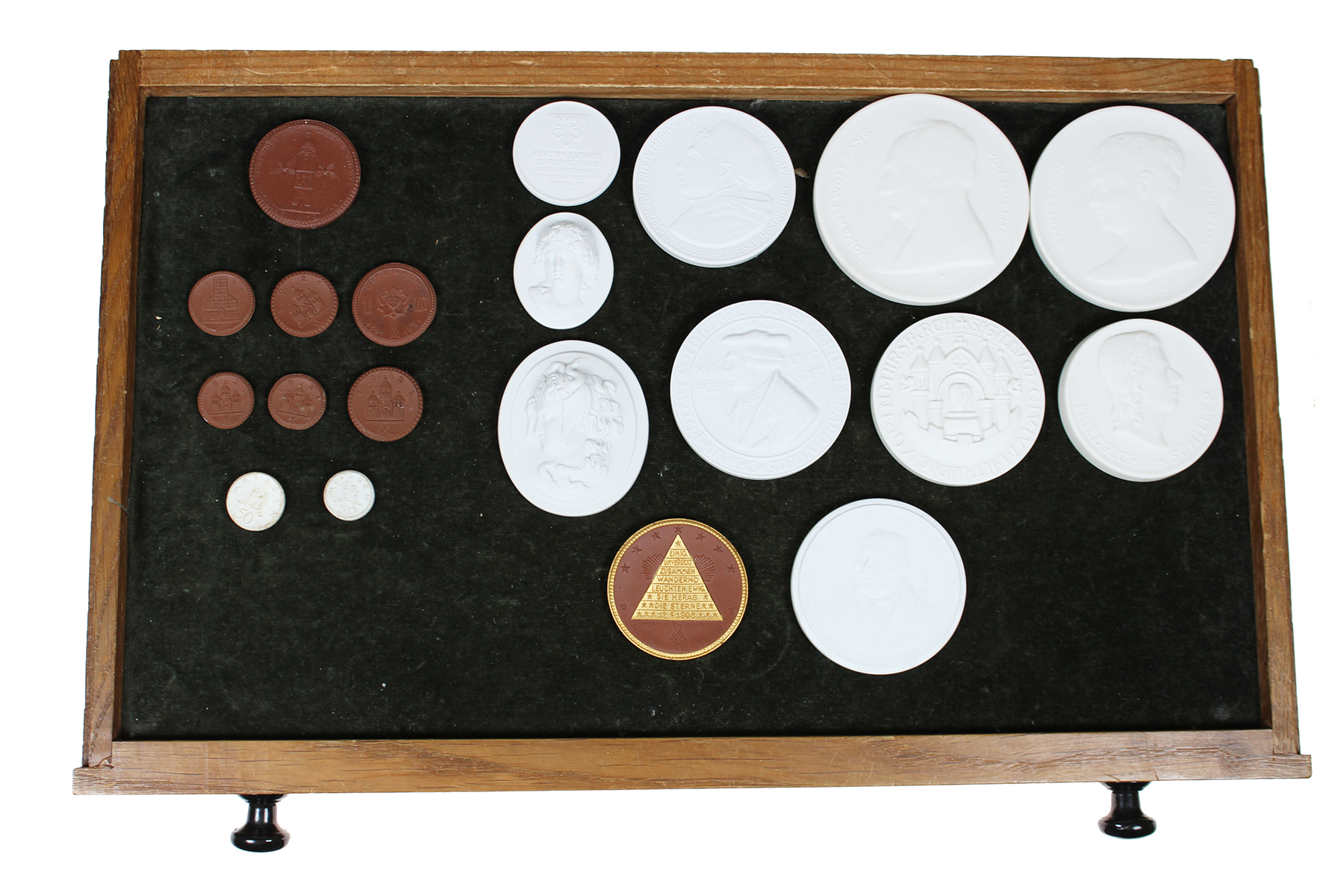 Plastic bakje (20) aardewerk penningen (Duitsland) van Meissens porselein (wit en bruin). Apart!