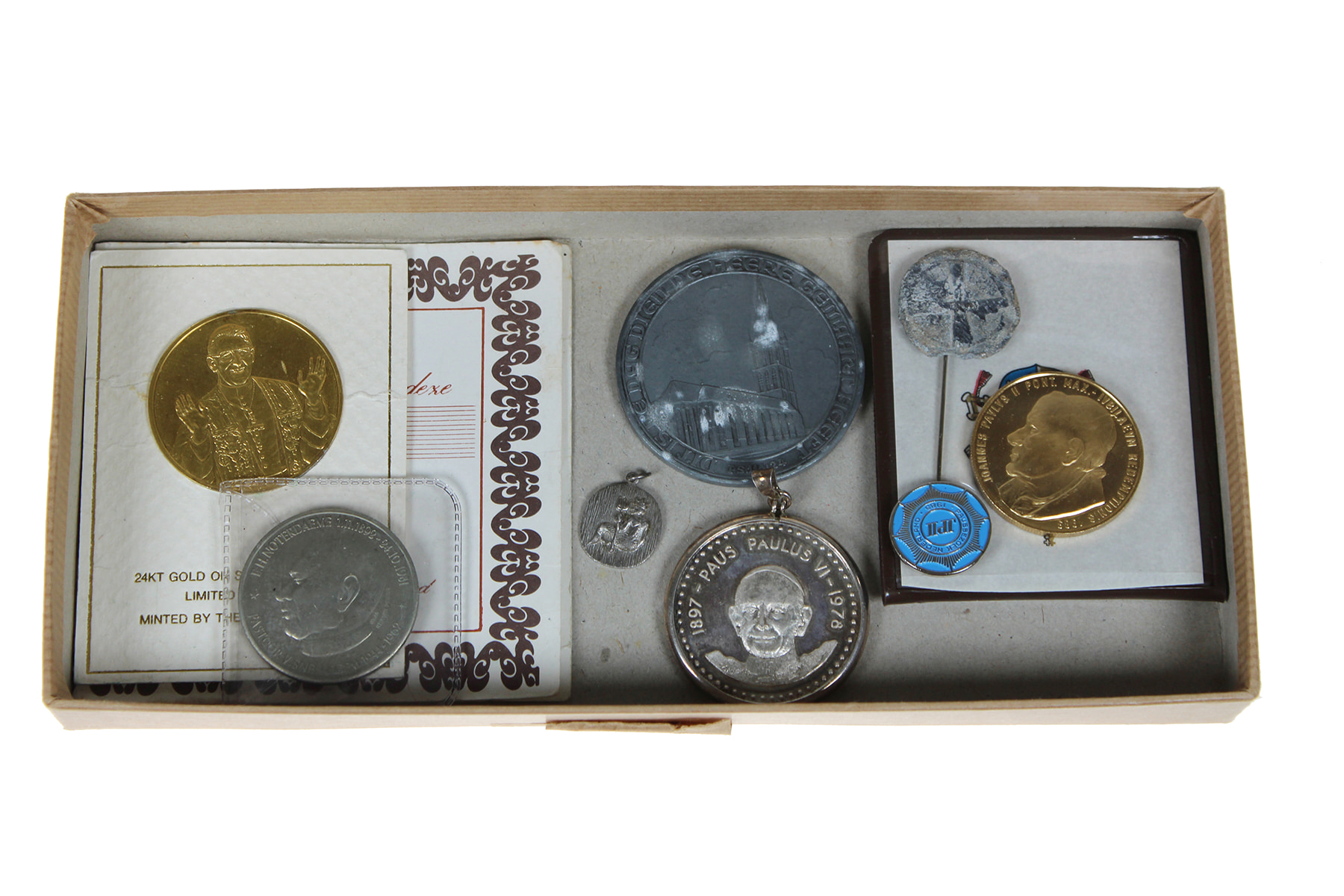 Doosje (7) religieuze penningen, binnen- en buitenland.