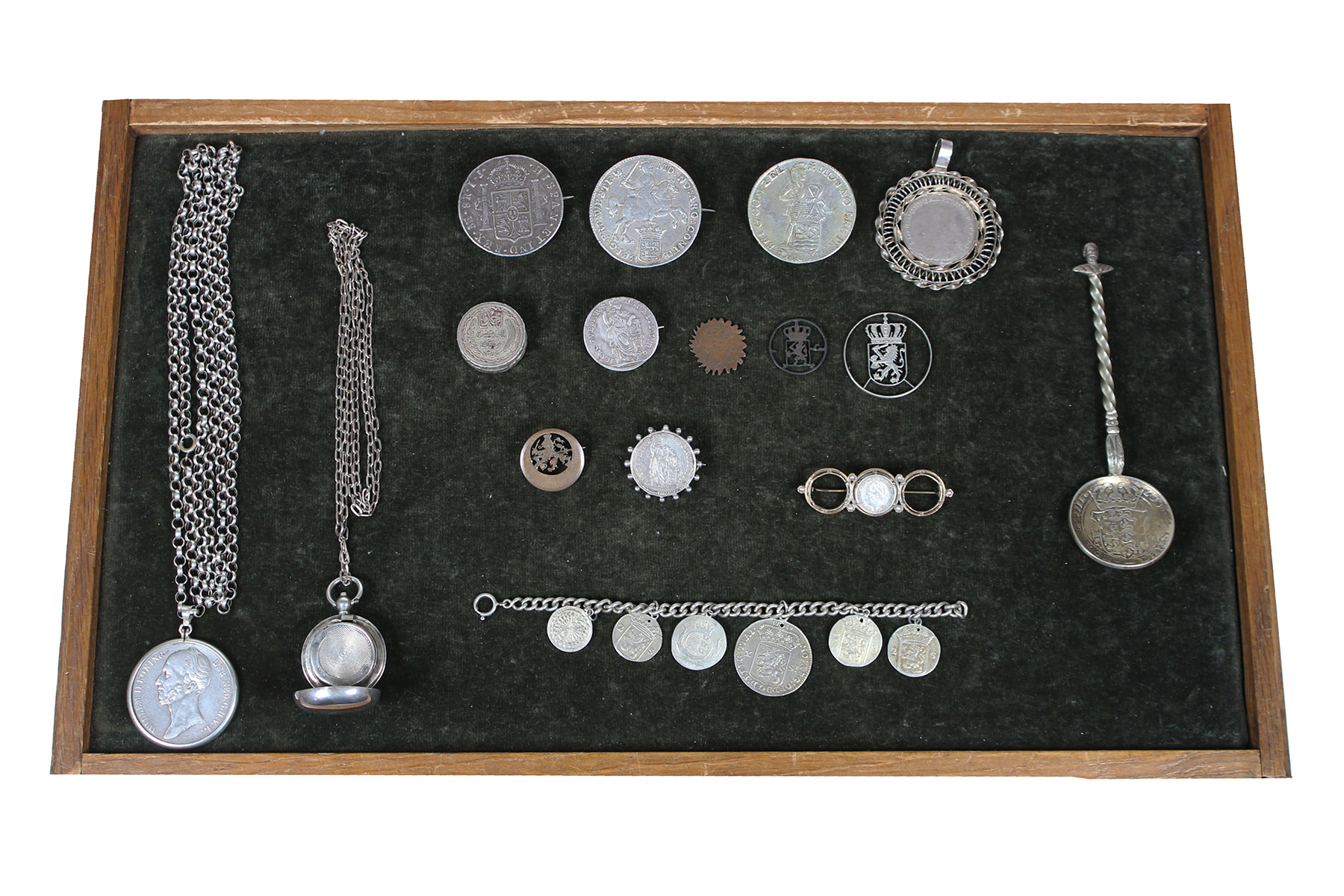 Blikje met triest muntvandalisme, o.a. zilveren rijders, dukaten en thalers. Nu voor de eeuwigheid tot sieraad vervaardigd. Ca. 275 gram bruto AR.
