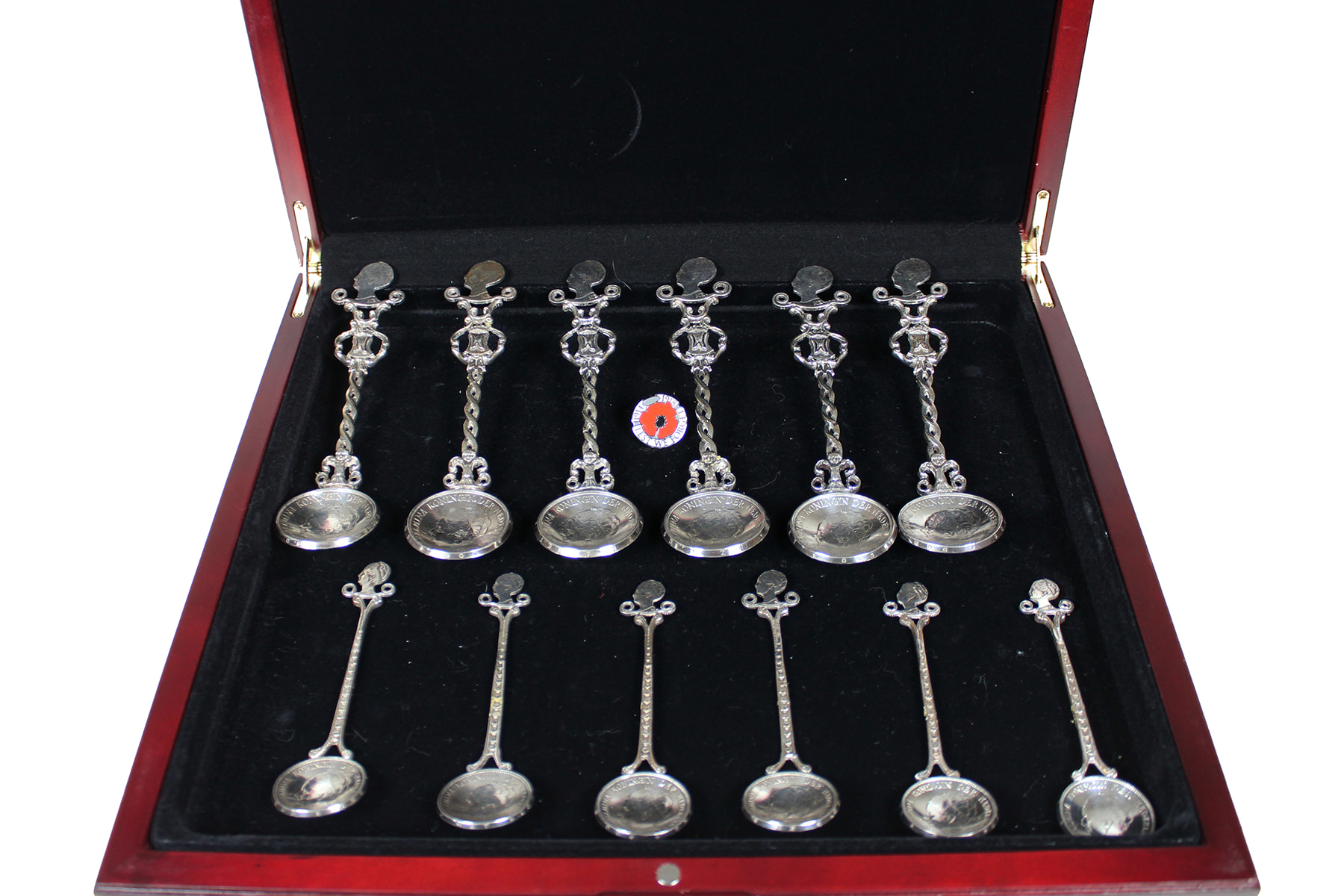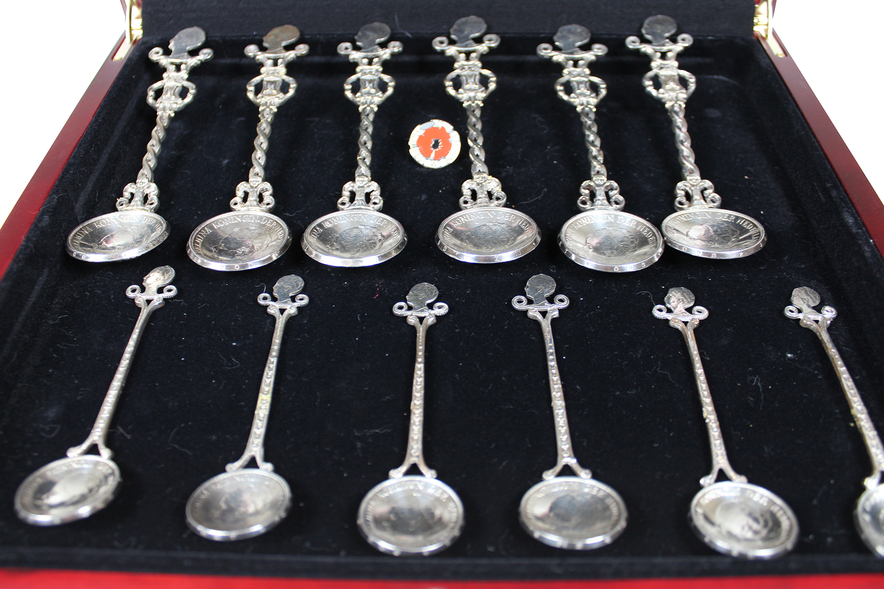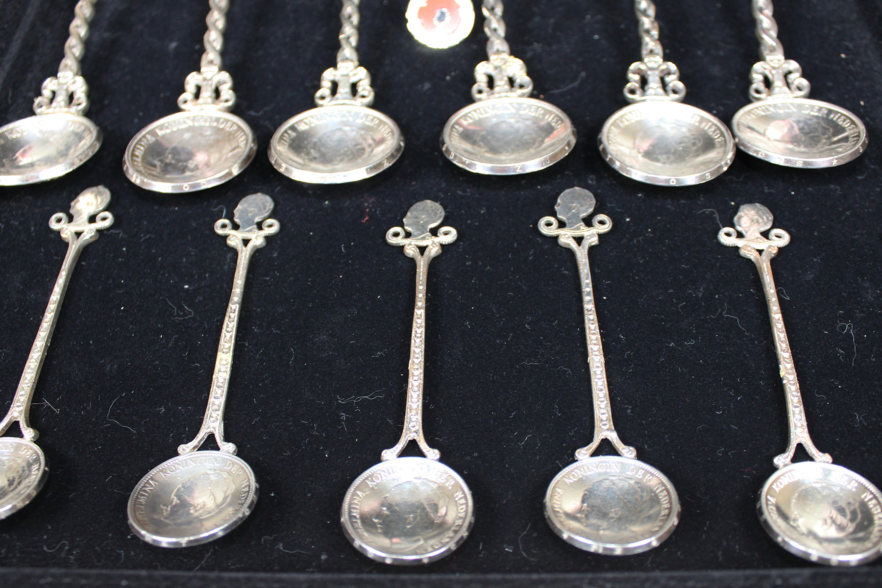 Voor de liefhebbers van numismatisch bekstek, 6 lepels vervaardigd uit Wilhelmina-rijksdaalders en idem 6 zilveren lepels vervaardigd uit Wilhelmina-guldens. Ongekend keurig staaltje huisvlijt!