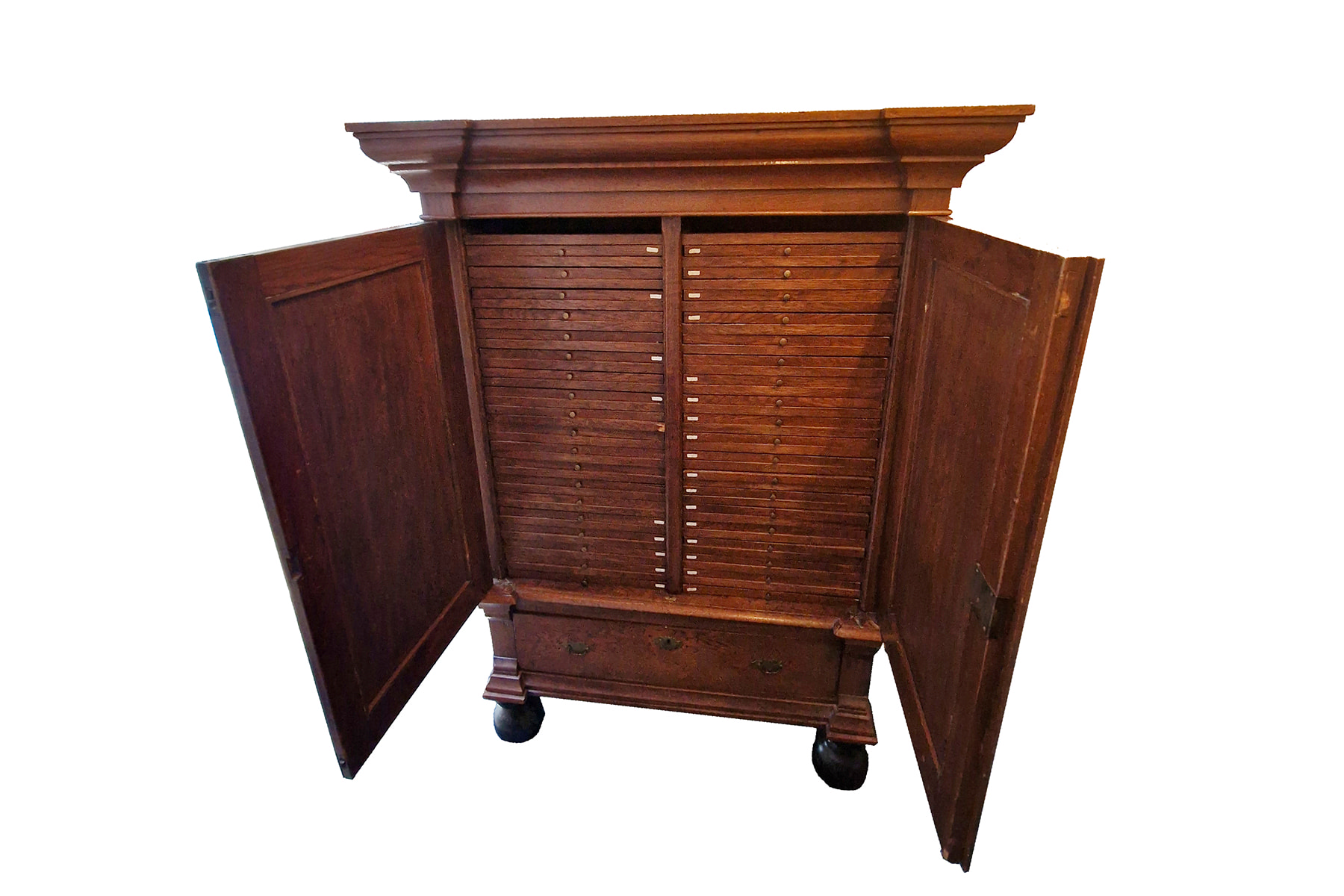 Authentiek penningkabinet in een formaat waarin ze tegenwoordig niet meer gemaakt worden. Afmeting: 119 x 51 x 170 cm. Voorzien van 38 lades.Dit mooie meubel heeft jarenlang de penningencollectie van ene mijnheer Groen in zich gehad. Van de eerdere herkomst is niets of weinig bekend.