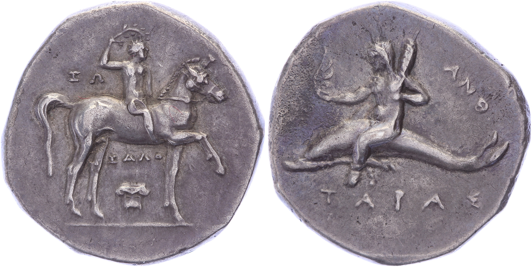 Circa 280-272 BC. AR Nomos [6,59 gm, 21,50 mm]. Youth on horseback right, crowning himself; ΞΩ to left, ΞΑΛΟ and Ionic capital below / Taras on dolphin left, holding aphlaston and distaff; TAPAΣ below, ANΘ to right. HN Italy 1014; SNG ANS 1142; Vlasto 803. Minor reverse porosity, toned gVF.