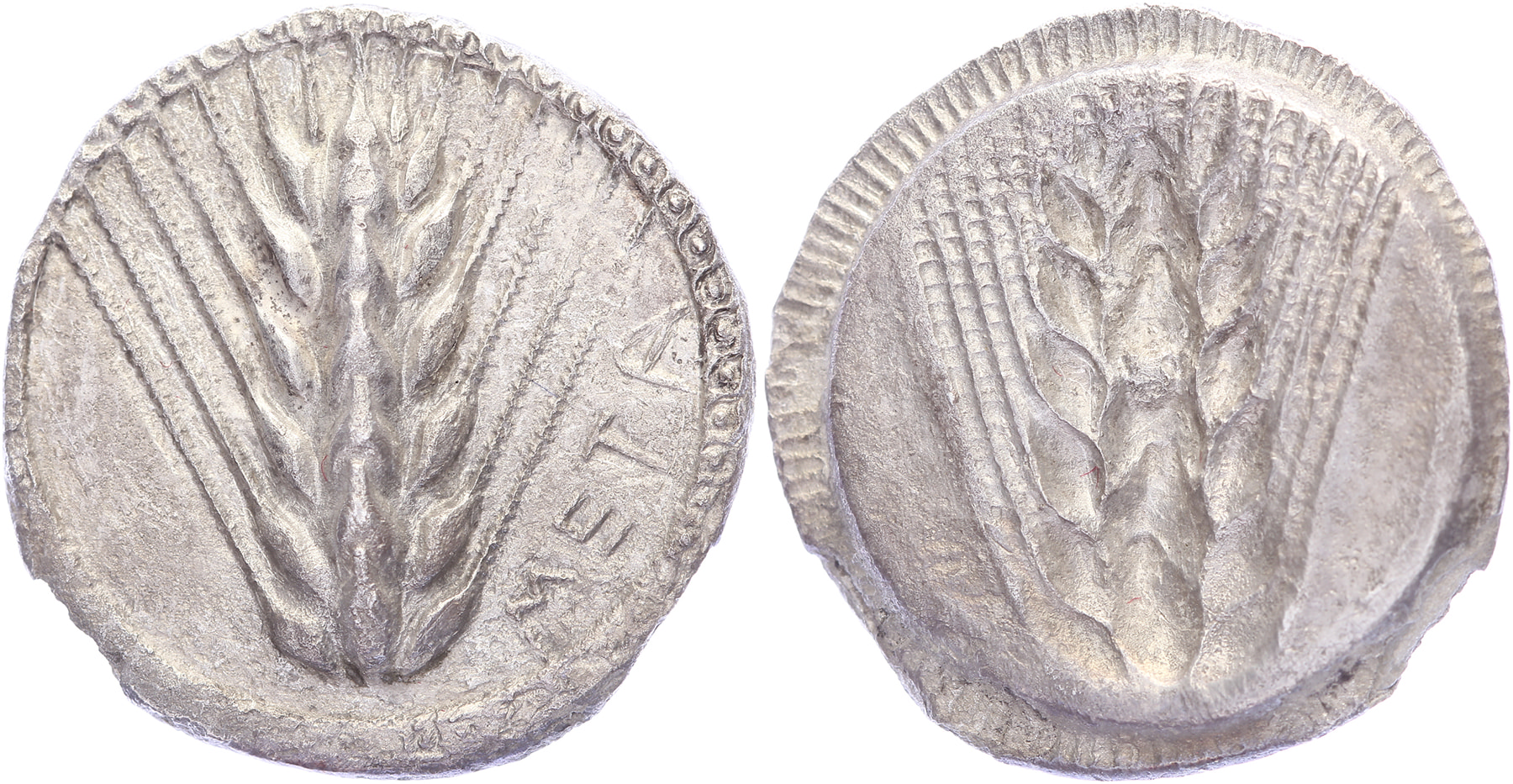Circa 540-510 BC. AR Nomos [7,40 gm, 24,45 mm]. META, barley ear/ Incuse barley ear.Noe Class VI; HN Italy 1479. A bit porous, gVF.