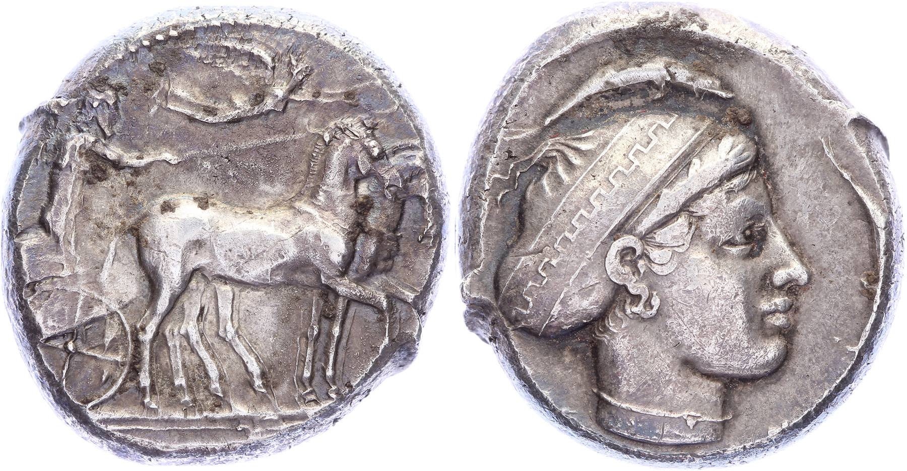 AR Tetradrachm [17,41 gm, 22,70 mm]. Charioteer, holding kentron and reins, driving slow quadriga to right; above, Nike flying to left, crowning charioteer with wreath / Head of Arethusa right, wearing double-hook earrings and necklace, hair enveloped in sakkos drawn together at top and decorated with a maeander pattern four dolphins and [ΣΥΡΑΚΟΣΙΟΝ] around. Boehringer 699 (V326/R441). Few deposits, toned aEF.