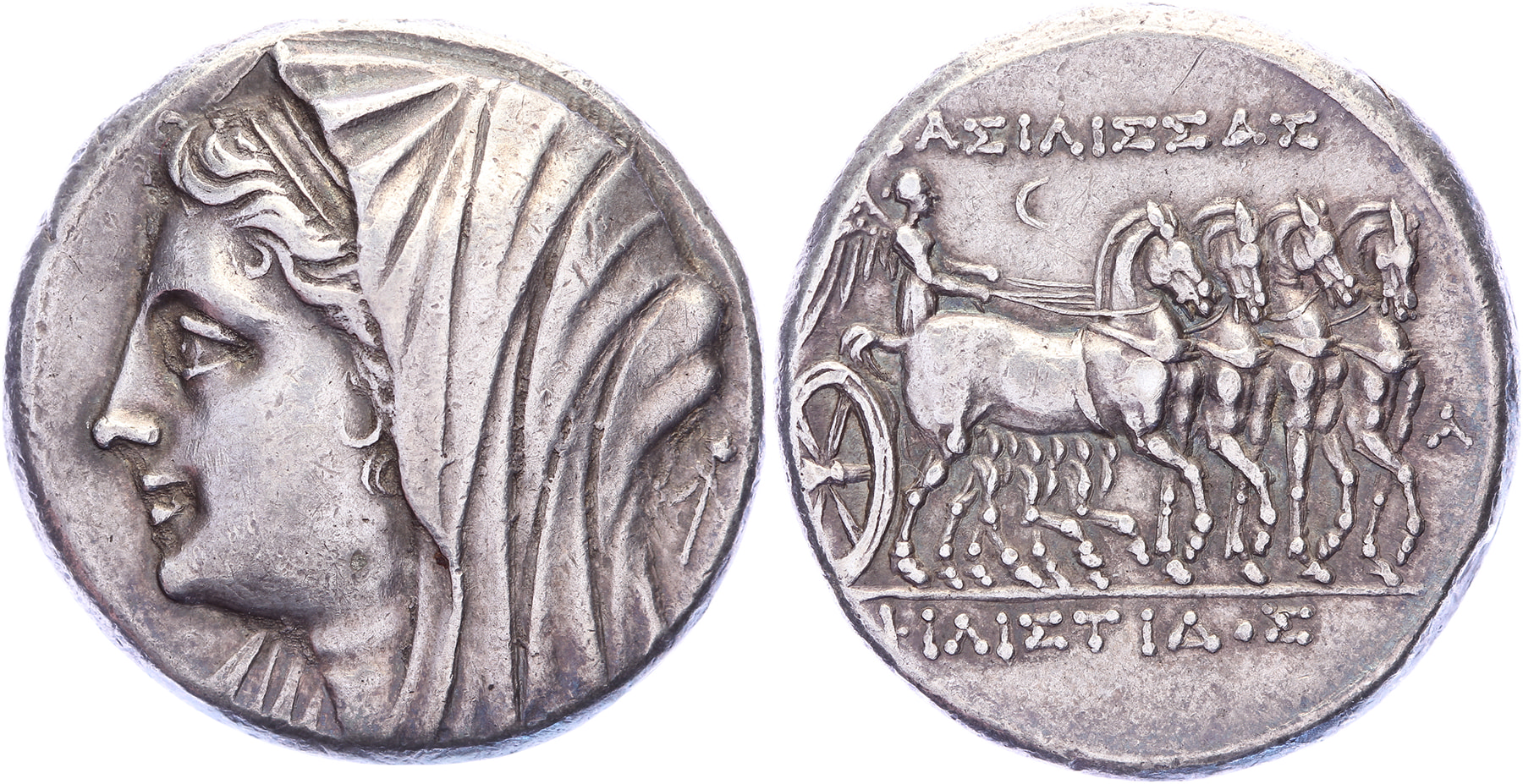 AR 16 Litrai [13,59 gm, 27,20 mm]. Struck 218/7-214 BC. Diademed and veiled bust of Philistis to left; behind, thyrsos / ΒΑΣΙΛΙΣΣΑΣ ΦΙΛΙΣΤΙΔ[ΟΣ] Nike driving quadriga moving slowly to right; above, crescent with points to right; to right, Α. SNG ANS 876. Lightly toned, aEF.