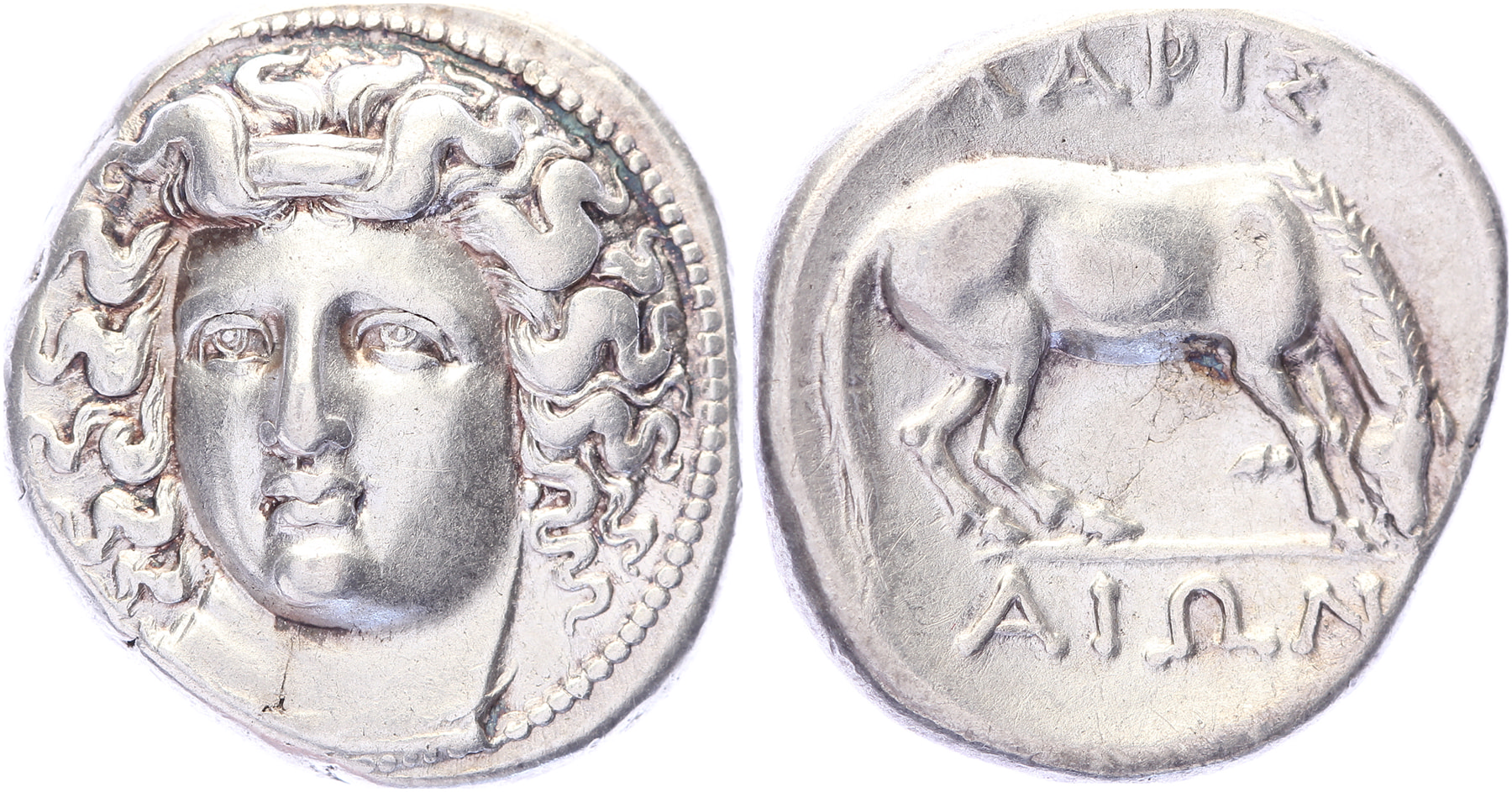 3rd-2nd century BC. AR Drachm. [6,05 gm, 18,00 mm]. Head of the nymph Larissa facing slightly to left, wearing ampyx and necklace / Horse grazing to right; ΛΑΡΙΣ / ΑΙΩΝ above and below. BCD Thessaly II 280. gVF.