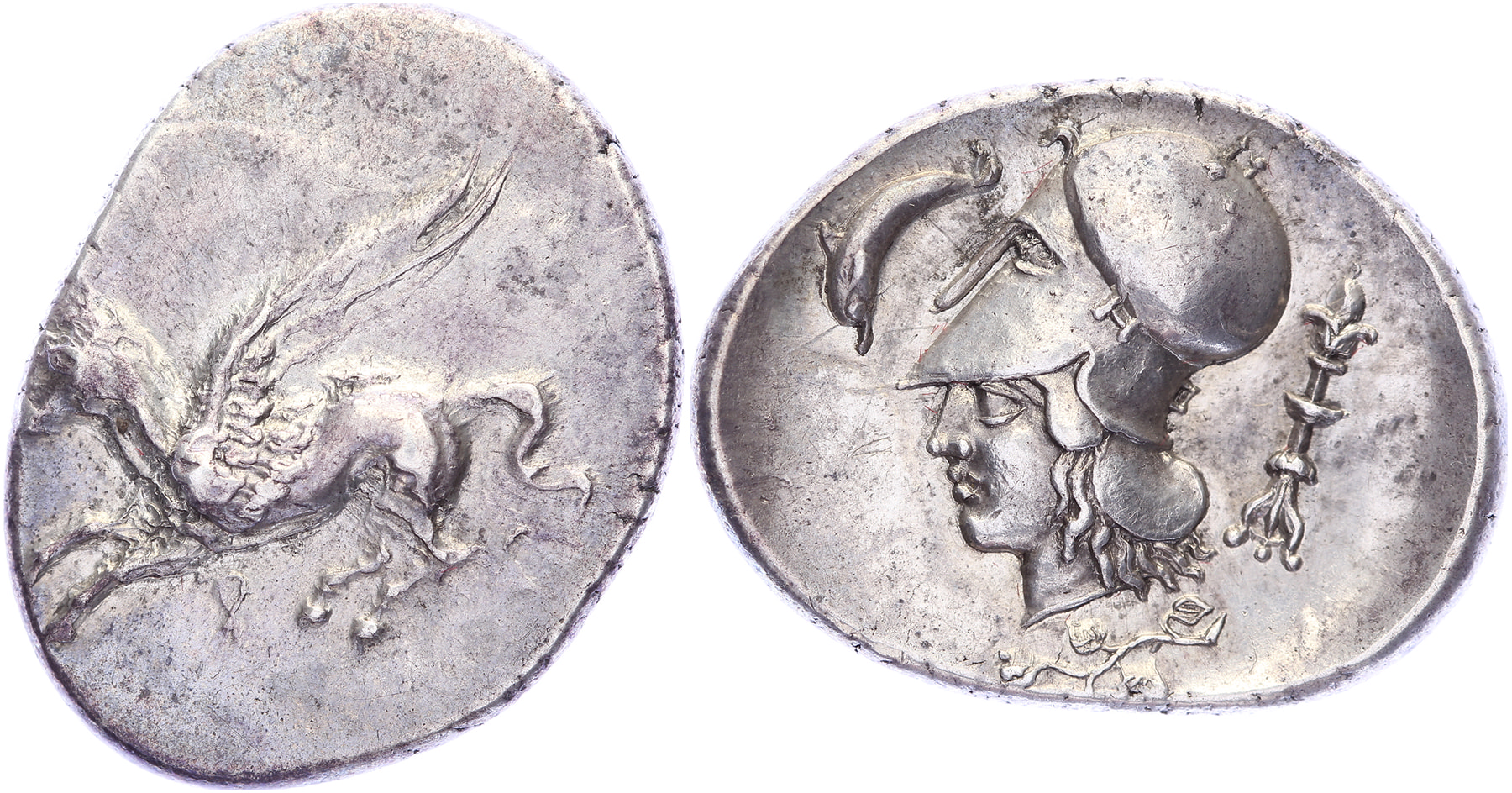 Circa 400-375 BC. AR Stater [8,58 gm, 26,40 mm]. Pegasos flying left / Head of Athena left, wearing Corinthian helmet; to left, dolphin; behind neckguard, thymiaterion; below, ivy branch with five leaves. BCD Corinth -. Calciati 324; Ravel 835. Obverse double struck, nicely toned EF.