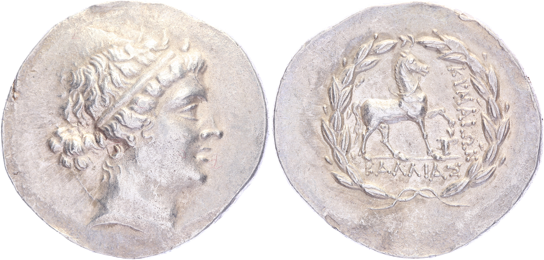 Circa 155-143 BC. AR Tetradrachm [16,90 gm, 33,60 mm]. Stephanophoric type. Kallias, magistrate. Head of the Amazon Kyme right, wearing tainia / Horse prancing right; one-handled cup below raised foreleg, KYMAIΩN to right, KAΛΛIAΣ below; all within wreath. Oakley dies 13/b; SNG von Aulock 1636; SNG Copenhagen 103; SNG Fitzwilliam 4313. EF.