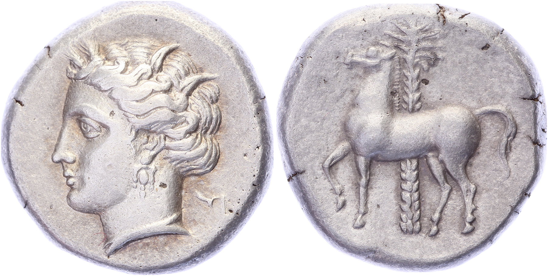 Circa 350 BC. AR Tetradrachm [17,03 gm, 24,60 mm]. Female head left, wreathed with corn, Punic letter M / Horse walking left in front of palm-tree. Jenkins 63 (O17/R57); SNG Oxford 2156 (same dies). gVF.
