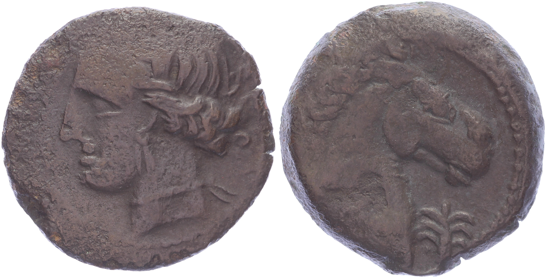 Circa 300-264 BC. Æ [4,23 gm, 19,20 mm]. Carthage or Sardinia mint. Wreathed head of Tanit left / Head of horse right; palm tree to right. CNP 252aa (Sardinia); MAA 57l (Carthage); SNG Copenhagen 173 (Sardinia). Minor roughness, VF.