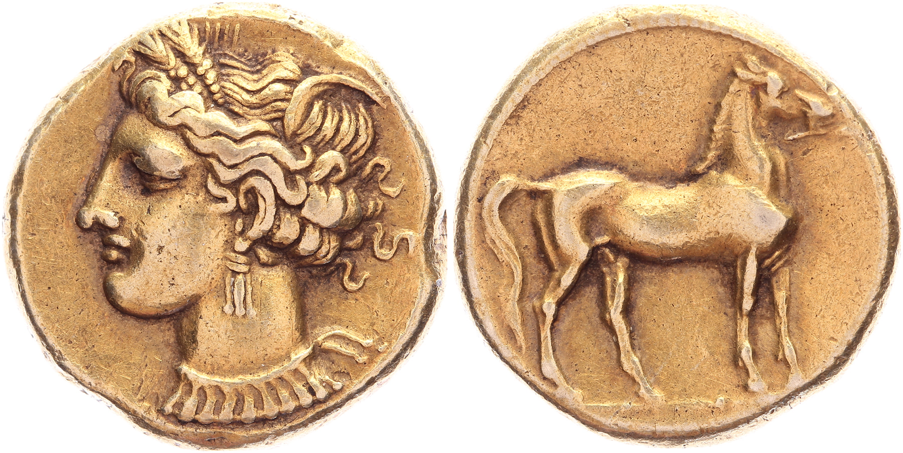 Circa 290-270 BC. EL Stater [7,38 gm, 18,35 mm]. Head of Tanit to left, wearing grain wreath, triple-pendant earring and pearl necklace with ten pendants / Horse standing to right; on ground line to right, pellet; in field next to horse’s left hind leg, two pellets. Jenkins & Lewis Group VII. VF.