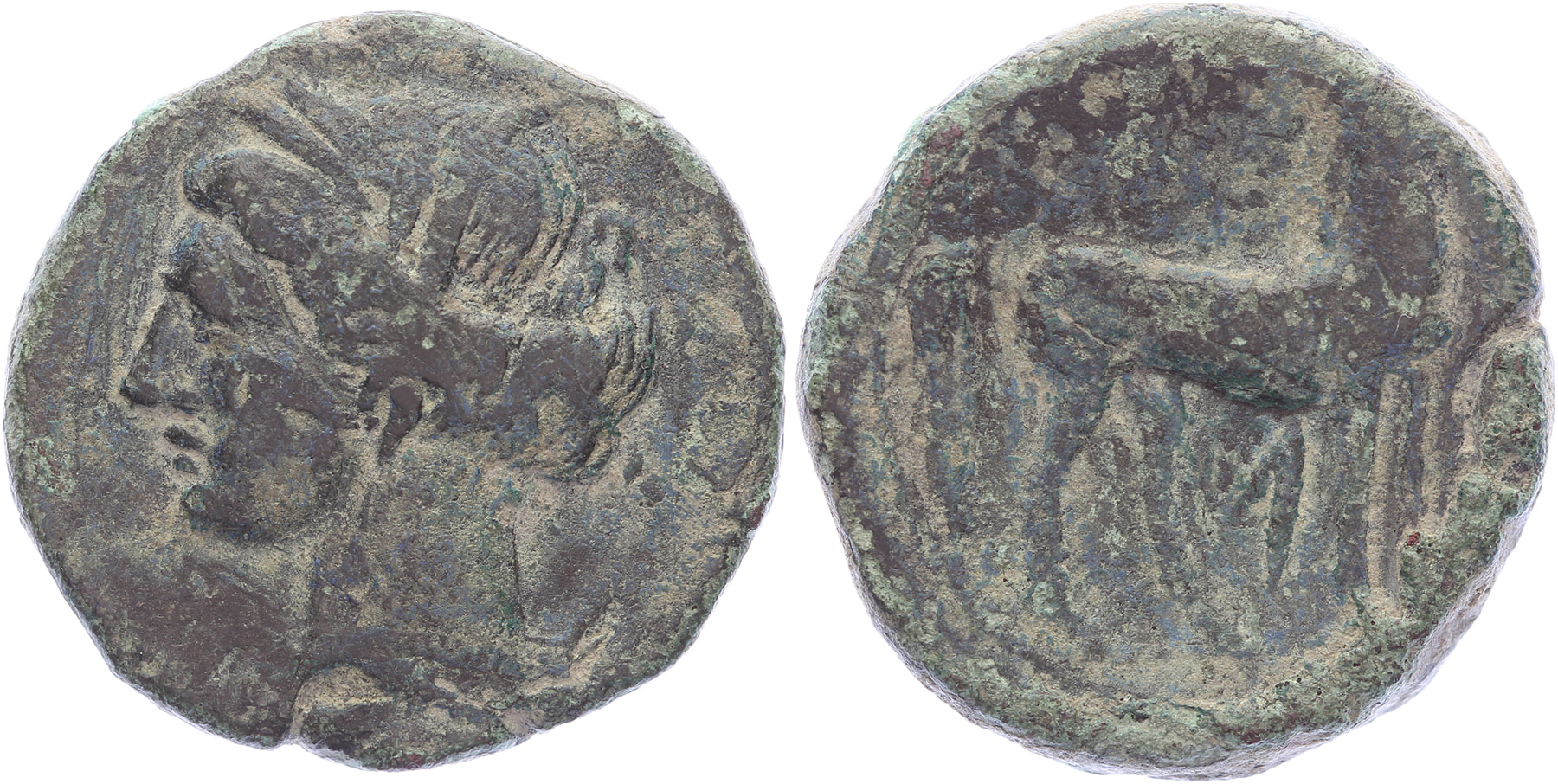 Second Punic War Issue. Circa 221-201 BC. Æ [7,21 gm, 21,85 mm]. Head of Tanit left, wreathed with grain, wearing pendant earring, dotted border / Horse standing right, head reverted; S (Punic) below horse and in right field, dotted border. SNG Copenhagen 311. aVF.