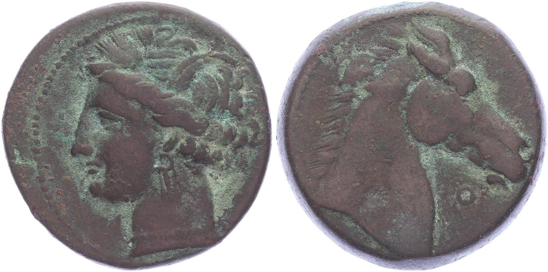 Circa 300-264 BC. Æ 18 [5,26 gm, 20,55 mm]. Sardinian mint. Wreathed head of Tanit to left / Head of horse to right, letter o to right. SNG Copenhagen 151. VF.