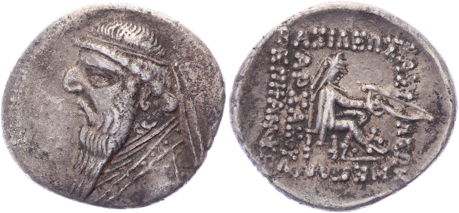 AR Drachm [3,66 gm, 20,85 mm]. Rhagai mint. Diademed bust to left / ΒΑΣΙΛΕΩΣ ΒΑΣΙΛΕΩN ΜΕΓΑΛΟY ΑΡΣΑΚΟY ΕΠIΦΑNOYΣ, Archer (Arsakes I) seated to right on throne, holding bow. Sellwood-27.1; Sunrise-293. Toned VF.