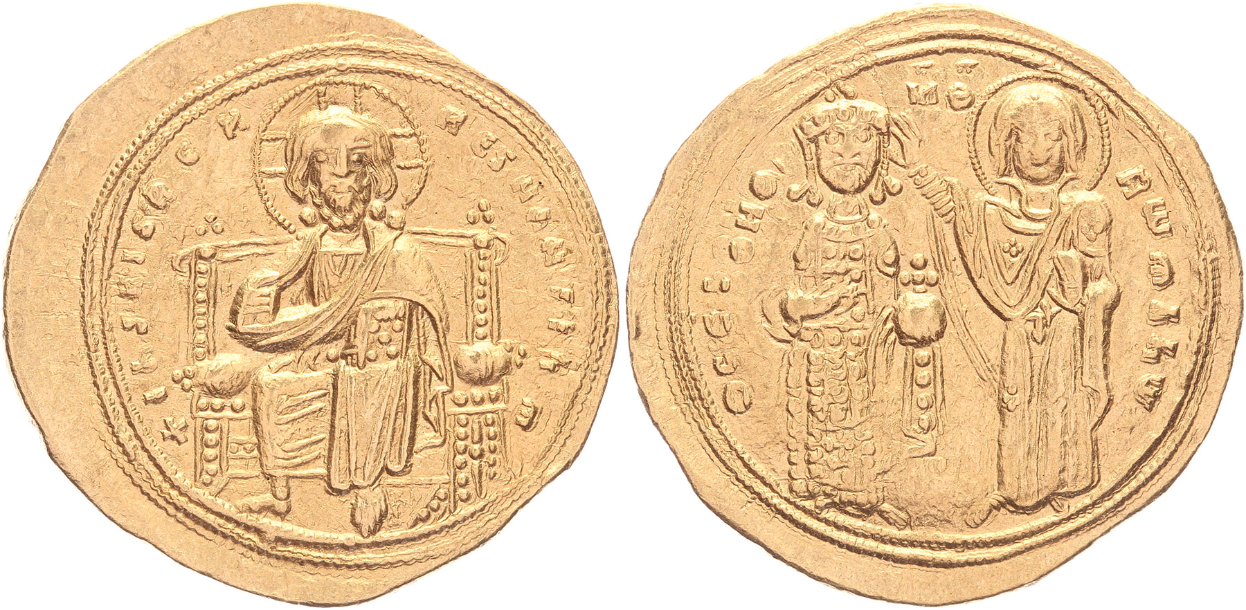 AV Histamenon Nomisma [4,39 gm, 25,40 mm]. Constantinople mint. XIS RCX REgNANTInm, Christ Pantokrator enthroned facing / ΘCΕ bΟΗΘ Μ:Θ RωmΑnω, the Virgin standing facing, wearing pallium and maphorium, crowning Romanus, standing facing, wearing saccos and loros and holding globus cruciger. SB 1819; Ratto 1972-73. gVF.