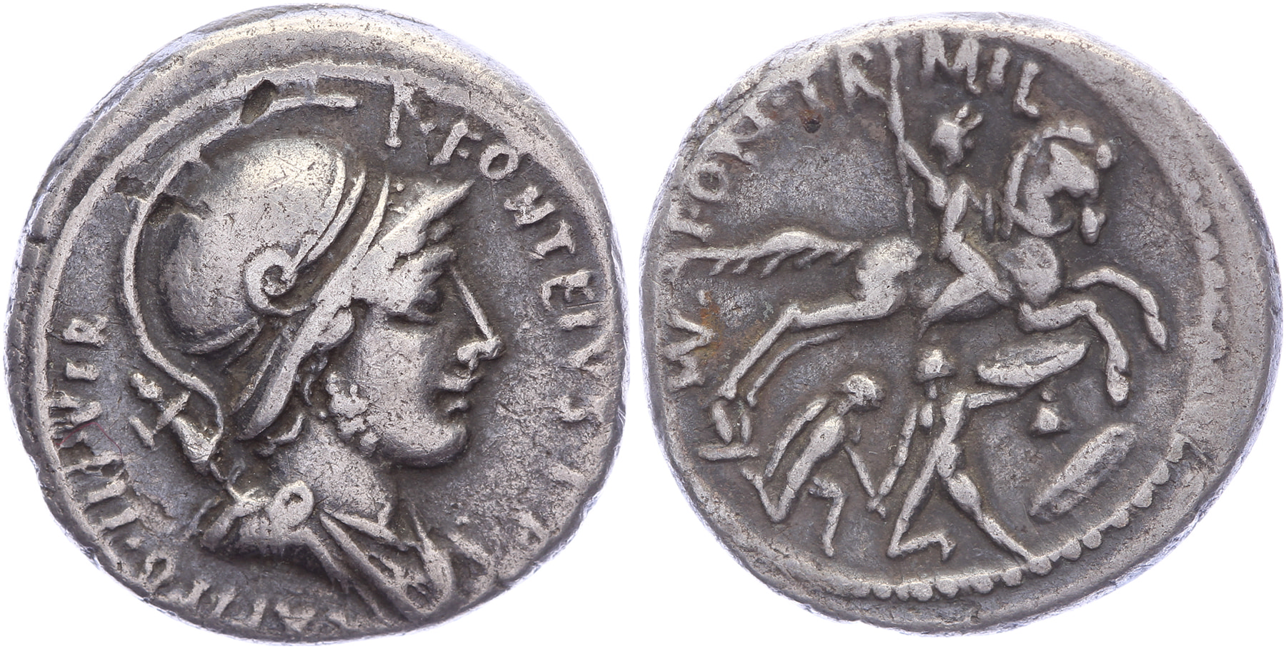 AR Denarius 55 BC, AR Denarius [3,87 gm, 18,40 mm]. Rome mint. P • FONTEIVS • P • F • CAPITO • III • VIR, bust of young Mars in helmet to right, / Cavalryman galloping to right, hurling spear at a warrior, kneeling to left below, about to attack a bound captive• FO • TR • MIL. Crawford 429/1, Sydenham 900. Toned VF.