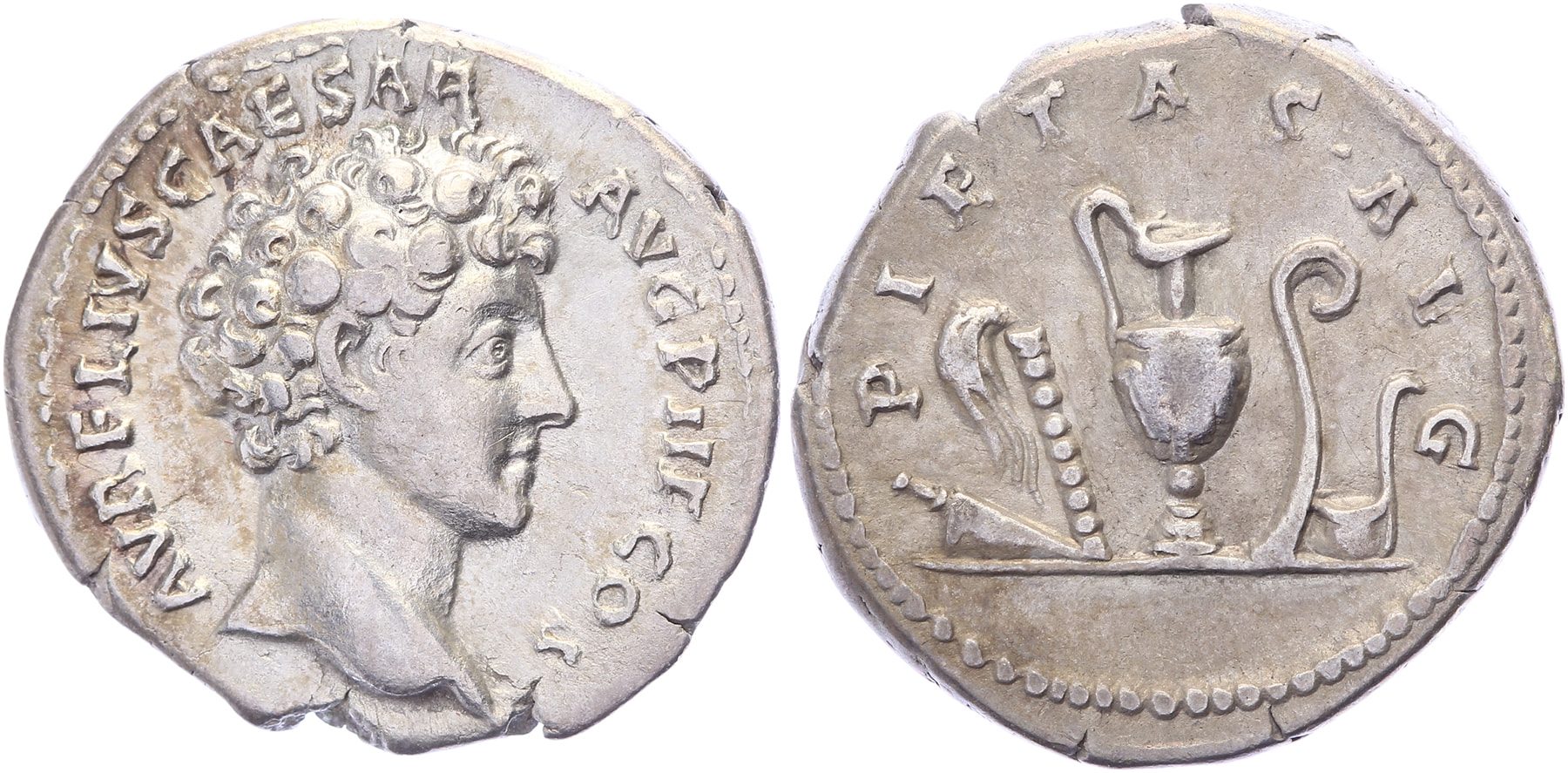 AR Denarius [2,98 gm, 19,00 mm]. Rome mint. Struck under Antoninus Pius, 140-4 AD. AVRELIVS CAES AR AVG PII F COS, bare head / PIETAS AVG Emblems of the pontificate: knife, sprinkler, ewer, lituus, and simpulum. BMC 277 (Antoninus Pius). Cohen 451. RIC 424a (Antoninus Pius). aEF.