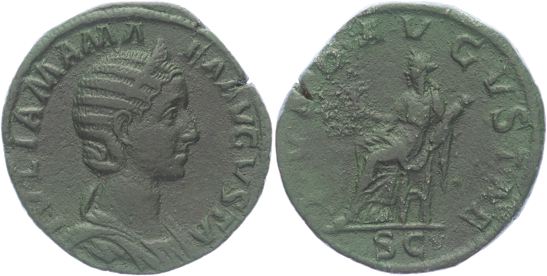 Æ Sestertius [19,38 gm, 29,95 mm]. Rome mint. Struck 228 AD. IVLIA MAMAEA AVGVSTA, diademed and draped bust right / IVNO AVGVSTAE, Juno seated left, holding flower in her right hand and infant with her left; SC in exergue. BMCRE 759; Cohen 33; RIC 683. VF.