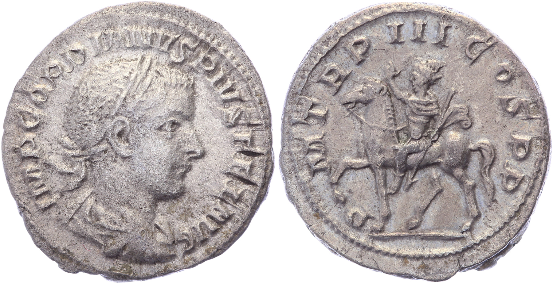 AR Denarius [2,68 gm, 20,40 mm]. Rome mint. Struck 240 AD. IMP GORDIANVS PIVS FEL AVG, laureate, draped, and cuirassed bust right / P M TR P III COS P P, emperor riding horse left, holding spear and raising hand. RIC 81; RSC 234. Toned gVF/EF.