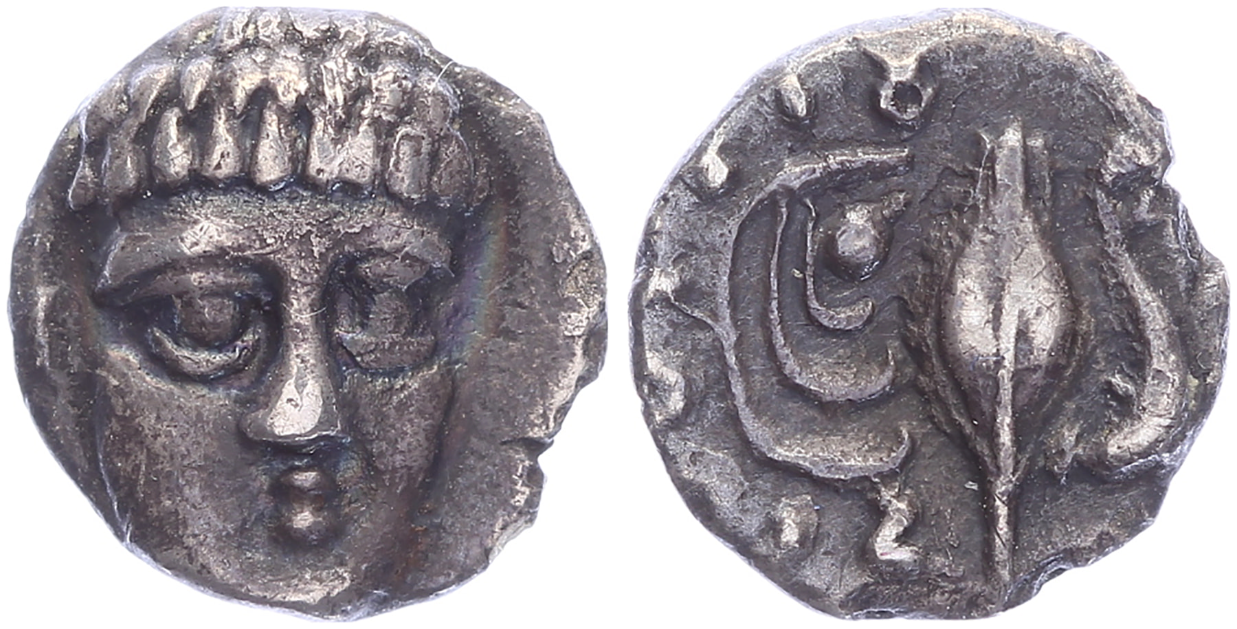 Circa 325-275 BC. AR Obol [0,46 gm, 8,7 mm]. Young male head facing slightly right / Corn-ear, mussel below, dolphin above; Oscan ethnic ‘fistlvis’ around. HN Italy 613; SNG ANS 567ff. Toned VF.