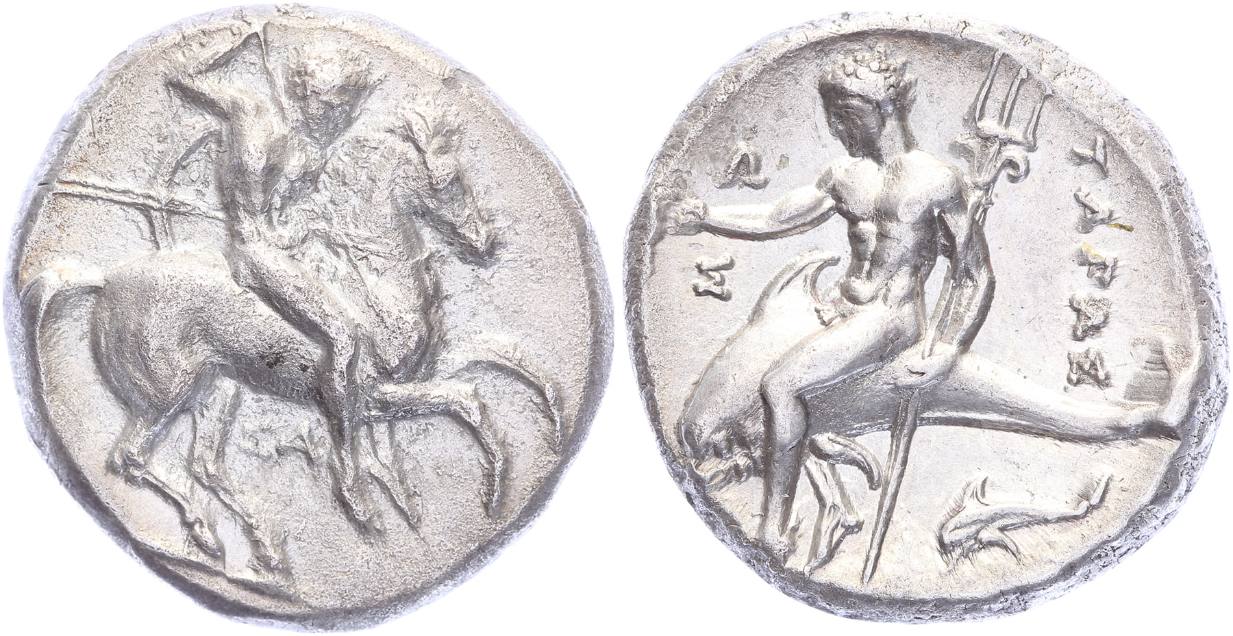 Circa 332-302 BC. AR Nomos of Didrachme [7,72 gm, 20,3 mm]. Nude rider on horseback to right, holding lance in right hand and shield with two javelins in left; ΣA behind / Phalanthos riding dolphin to left, holding trident and cantharus; TAPAΣ behind. Vlasto 614-18; HN Italy 937. Minor porosity, VF.Purchased from Jean Elsen, September 1996, Auction 46, lot 173