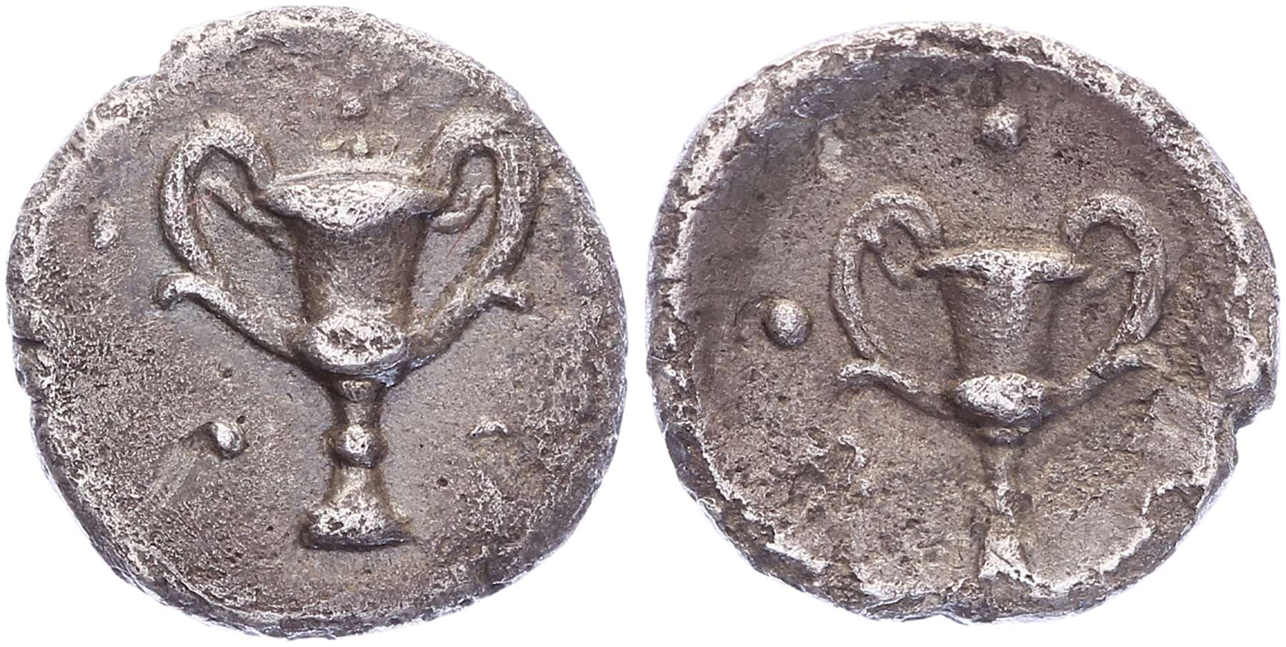 Circa 280-228 BC. AR Pentonkion [0,55 gm, 10,6 mm]. Kantharos; around, five pellets / Kantharos; around, five pellets. HN III 1076. Vlasto 1621. Minor roughness, toned VF. Purchased from Tom Vossen, December 2006