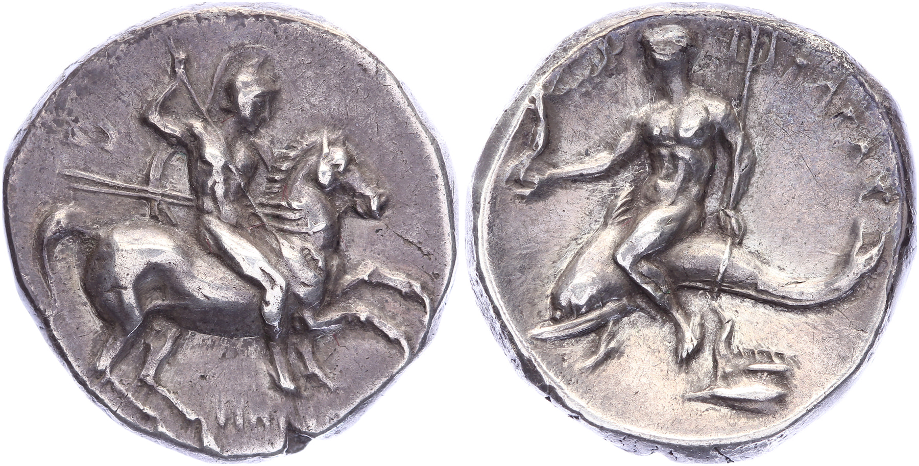 Circa 280-272 BC. AR Didrachm or Nomos [6,46 gm, 20,9 mm]. Ey... and Phintylos, magistrates. Nude rider on horse galloping to right, stabbing with spear held in his right hand and holding two other spears and shield in his left; to left, EY; below, ΦINTYΛOΣ / TAPAΣ, youthful oikist, nude, riding dolphin to left, holding Nike in his right hand and trident in his left; to lower right, prow. HN Italy 1002; Vlasto 723. Toned gVF.Purchased from Gijs Henzen, February 1996