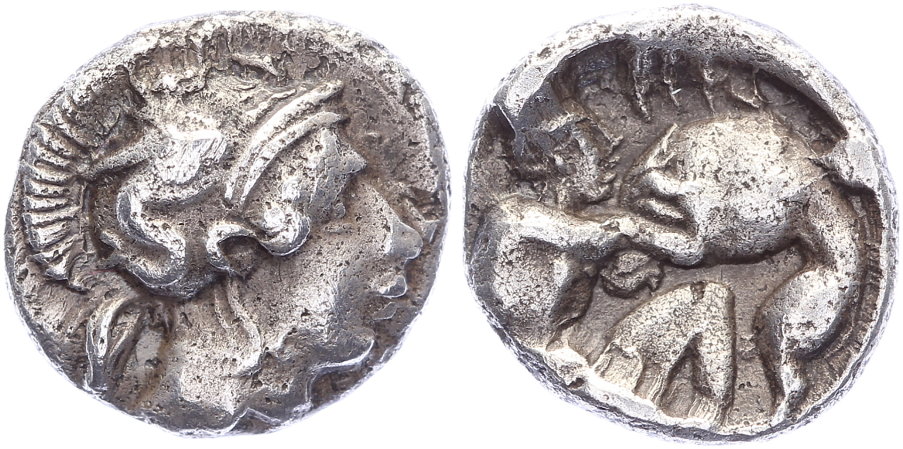 433-380 BC. AR Diobol [1.2 gm, 11,4 mm]. Head of Athena right / HE, Herakles strangling the Nemean Lion. HN Italy 1360. Minor porosity, VF.