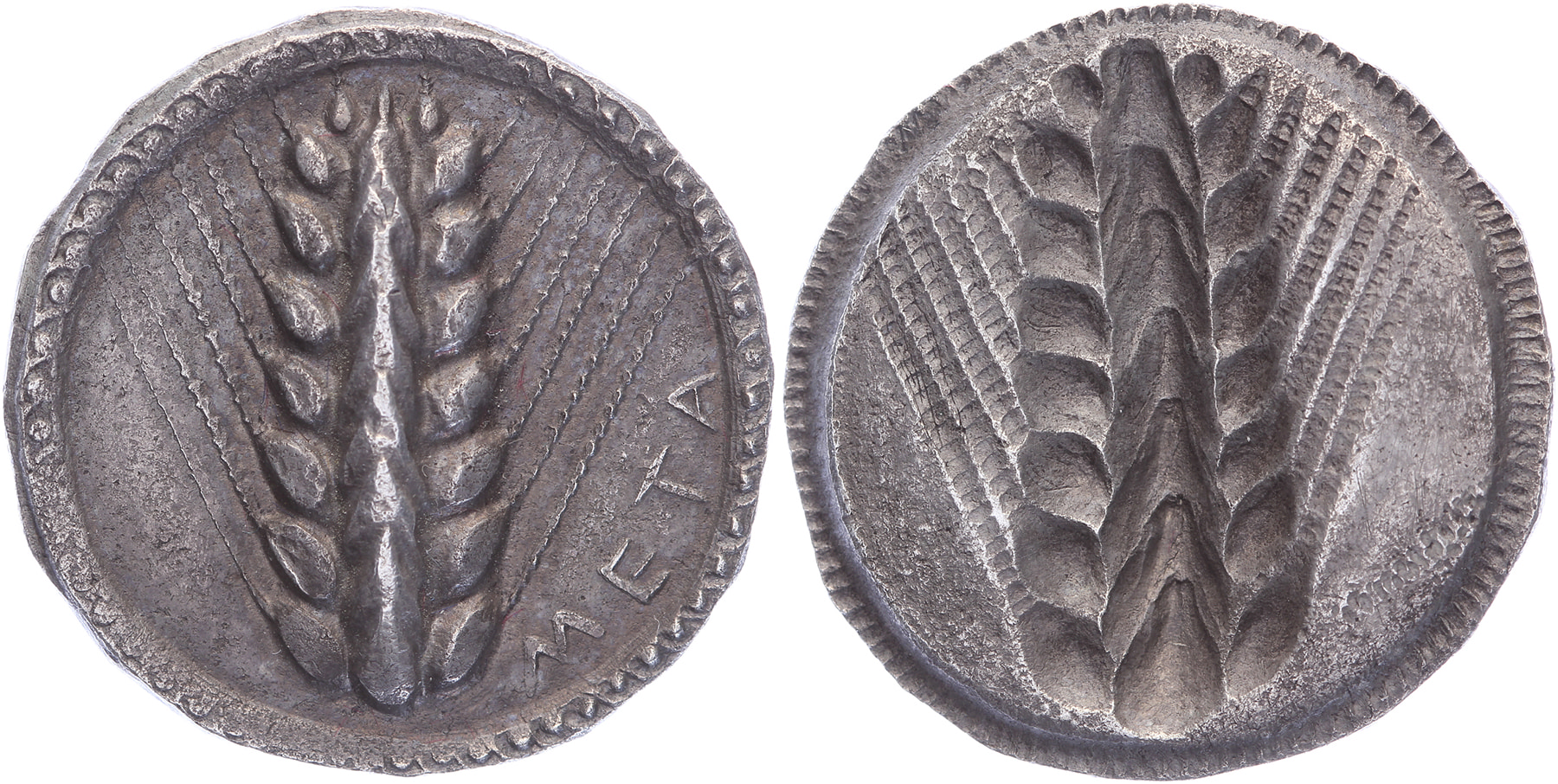 Circa 540-510, AR Nomos [7,65 gm, 25,8 mm]. META, ear of barley / the same, incuse. Noe 123 (unlisted dies); SNG Copenhagen 1167; SNG München 935; HN 1479. Nicely toned, gVF. Purchased from Rauch Auction 50, lot 45, April 1993