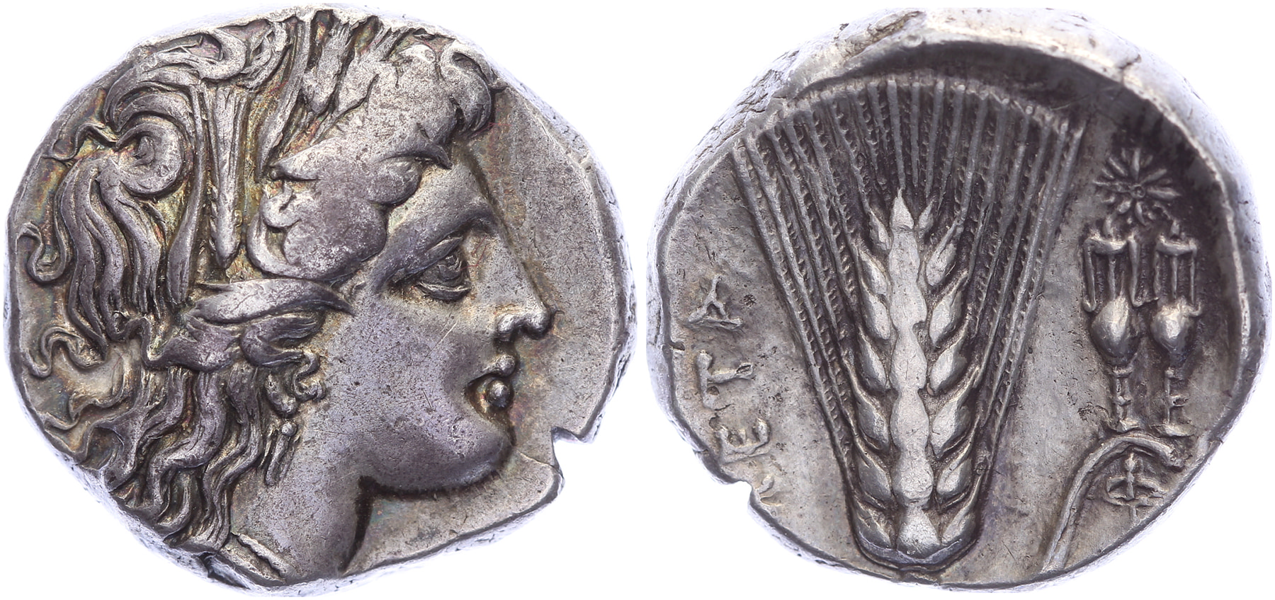 Circa 330-290 BC. AR Nomos [7,85 gm, 19,9 mm]. Wreathed head of Demeter right; [ΔΩPI below chin] / Barley ear with leaf to left; ΦΙ in lower right field, META to left. Johnston Class C, 5.17 (same dies); HN Italy 1582; SNG ANS 456 (same dies). Toned gVF.Purchased from Jean Elsen, Auction 51 lot 107, September 1997,