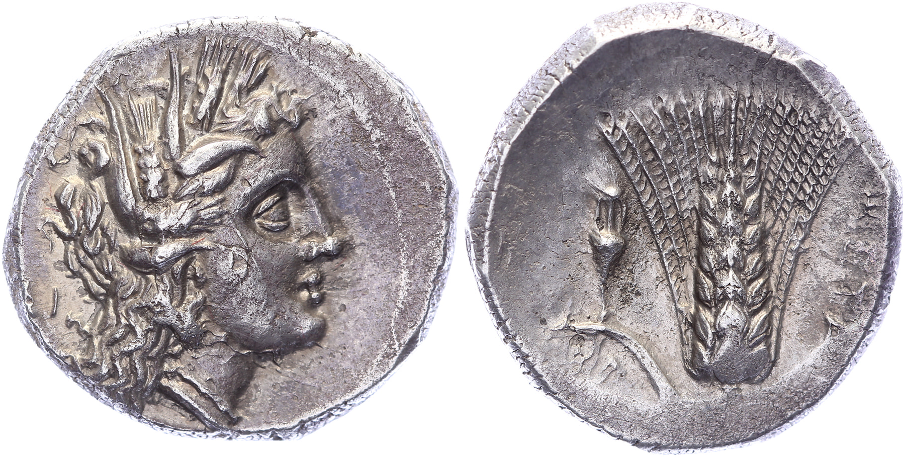 Circa 290-280 BC. AR Nomos [7,60 gm, 21,5 mm]. Head of Demeter right, wearing earring and necklace; ΔI behind / META, seven-grained barley ear with leaf to left; amphora above leaf, [TA] below leaf. Johnston Class D, 3.10 (same dies); SNG ANS 509 (same dies); HN Italy 1619. Fee minor die breaks, toned gVF.Purchased from Tom Vossen, Januari 2003