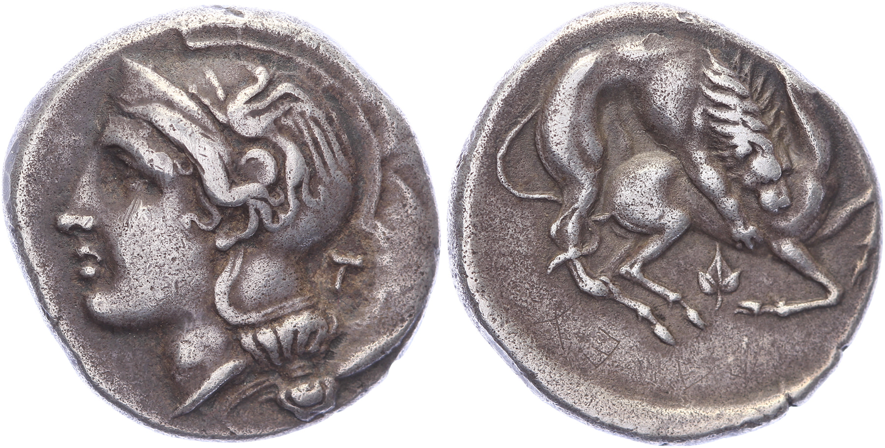 Circa 400-340 BC. AR Didrachm or Nomos [7,54 gm, 20,8 gm]. Head of Athena to left, wearing crested Athenian helmet decorated with a griffin on the bowl; T behind / [YEΛHTΩN], lion attacking stag right; below, ivy leaf. HN Italy 1279; Williams 224 (O138/R172). Minor reverse scratch, reverse graffiti and somewhat off centre, toned VF. Purchased from Holleman, September 1997