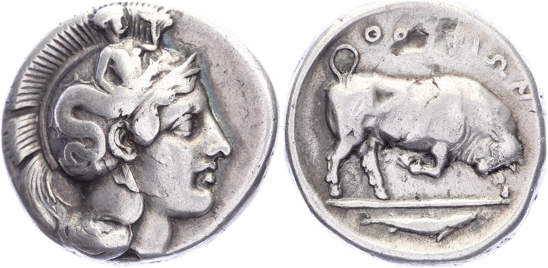Ca. 400-350 BC. AR Stater [7,63 gm, 20,3 mm]. Head of Athena right, wearing crested Attic helmet ornamented with Scylla right on bowl, pointing forward with left hand and holding spear / ΘΟΥΡΙΩΝ, bull butting right, tunny fish right in exergue. SNG ANS 1009; SNG Lockett 504; SNG Oxford 958; HN Italy 1800. Some lamination, aVF.