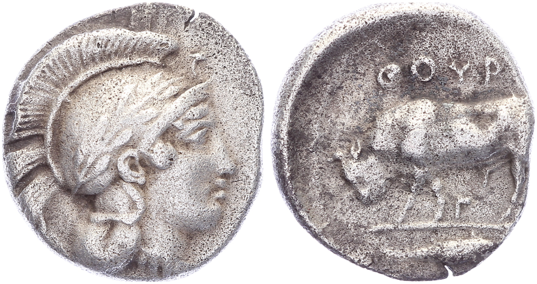 Circa 443-400 B.C. AR Triobol. [1,21 gm, 11,6 mm]. Head of Athena right, wearing crested Attic helmet decorated with wreath; above vizor / ΘΟΥΡ, bull standing left; above, below, fish in exergue. HN Italy 1759; SNG ANS 1113-1115. 443-425 BC. Porous, VF.