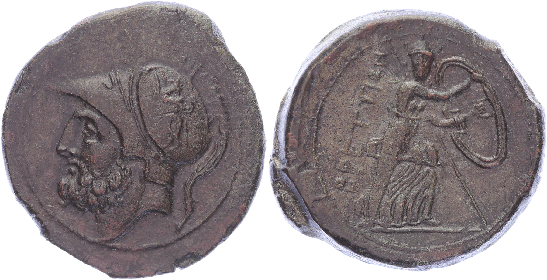 Circa 208-203 BC. Æ Double Unit (Didrachm) [14,87 gm, 27,2 mm]. Helmeted head of Ares left / Athena advancing right holding shield and spear; BPETTIΩN to left. HN Italy 2003. gVF.Purchased from F. Javorṡek München, September 1999; Ex Lanz, juni 1999, Auction 92, lot 109