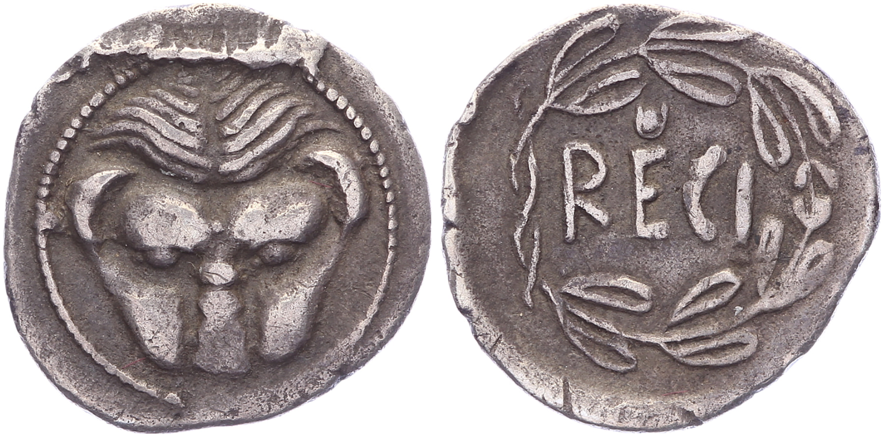Circa 445-435 BC. AR Litra [0,73 gm, 13,2 mm]. Lion’s head facing, seen from the front and above / RΕCΙ within an olive wreath tied at the left. Herzfelder Bα; HGC I, 1651; HN III 2485; SNG ANS 653 var. Toned VF.Purchased from Tom Vossen, May 2003