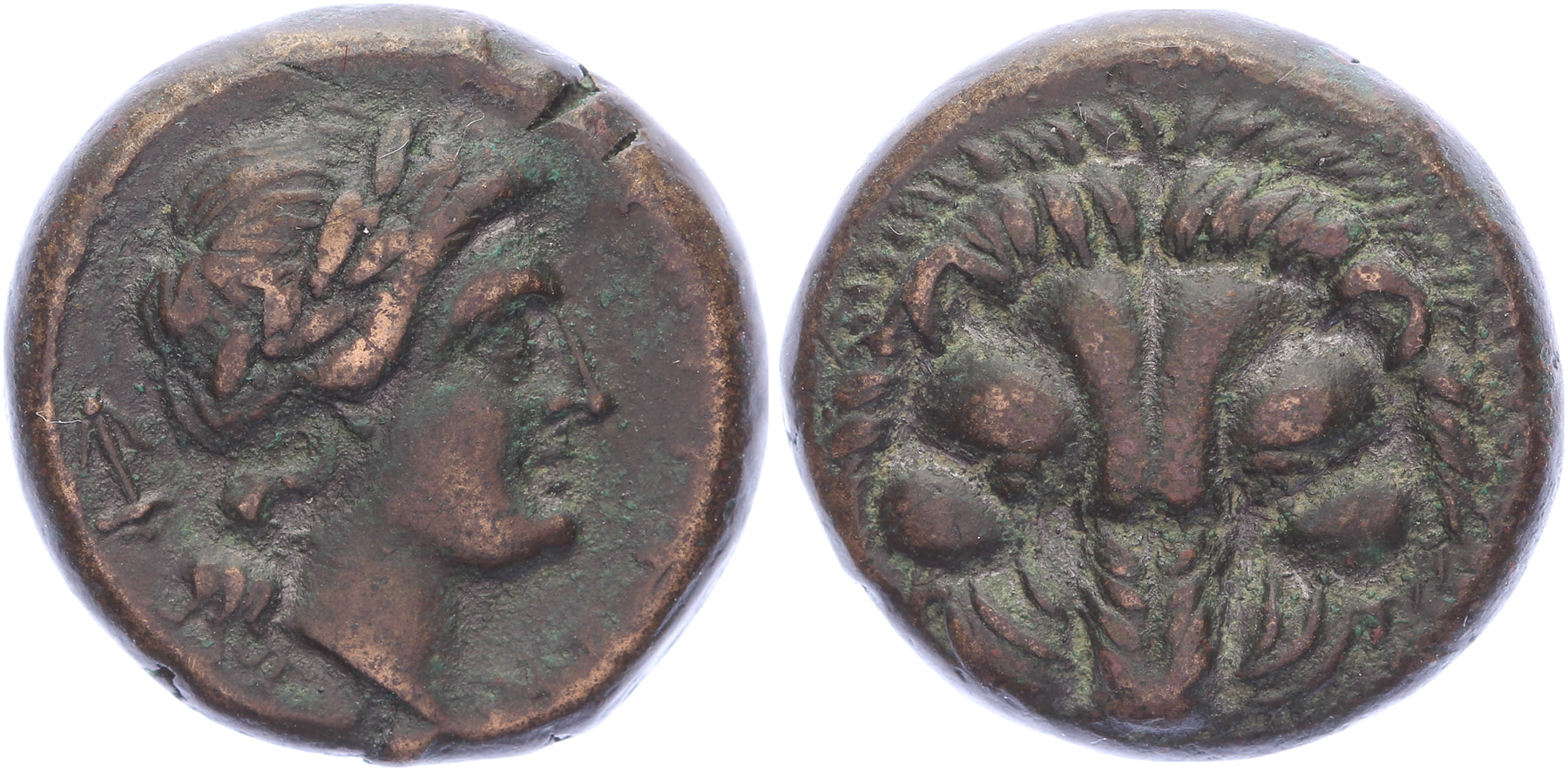 Circa 351-280 BC. Æ [8,84 gm, 20 mm]. Facing lion’s mask / Laureate head of Apollo right; anchor behind. HN Italy 2534a. Nice VF.
