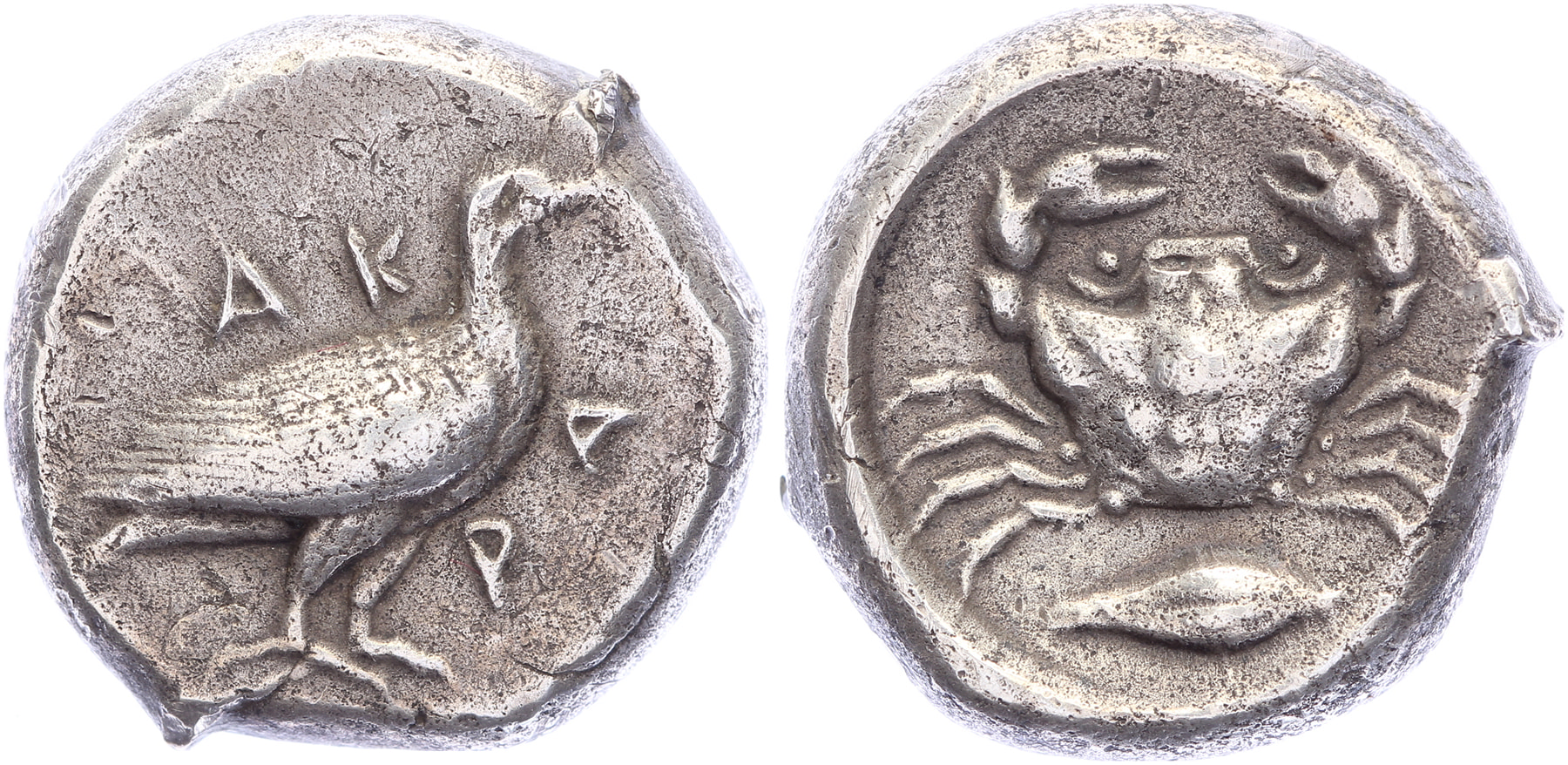 Circa 480/478-470 BC. AR Didrachm [8,51 gm, 18,3 mm]. AK-PA, Sea eagle standing right / Crab; grain ear below; all within incuse circle. Westermark, Coinage, Period I, Group IV, 272 (O89/R186); HGC 2, 94; SNG ANS 956 = Ognina 10 (same dies); SNG München 57 (same dies); Rosen 29 (same dies). Toned, minor porosity, VF.Purchased from Rietdijk Auctions, June 2000, Auction 369, lot 795