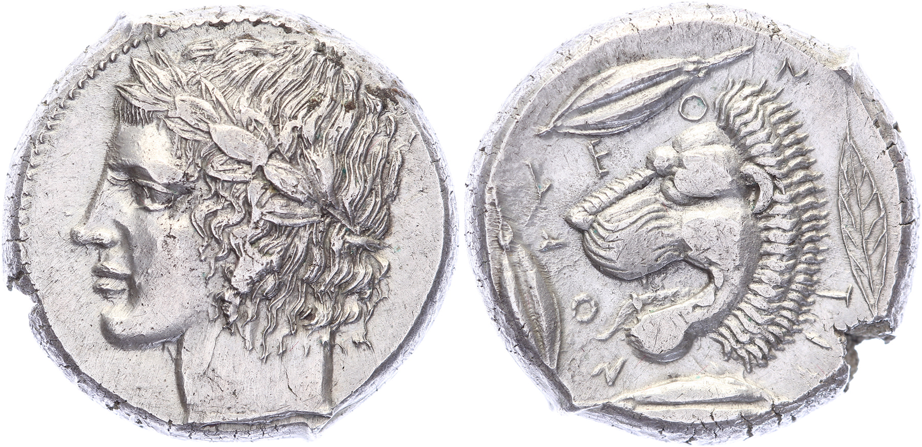 Circa 430-420 BC. AR Tetradrachm [17,57 gm, 24,5 mm]. Laureate head of Apollo left / Lion’s head with protruding tongue left, surrounded by three barley grains and a laurel leaf. SNG ANS 257; Rizzo pl. 24,4. EF.Purchased from Rietdijk Auctions, June 2000, Auction 369, lot 801