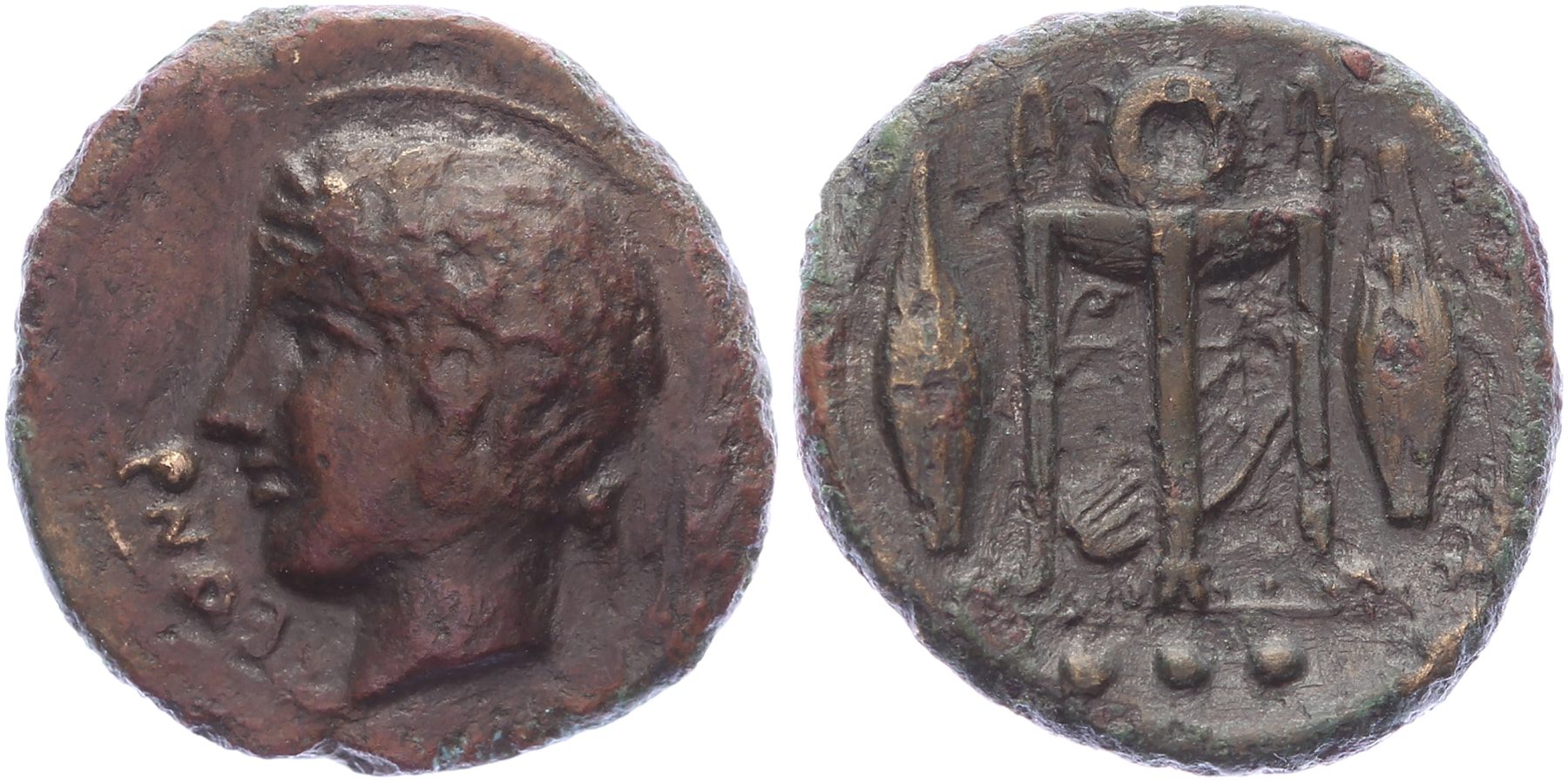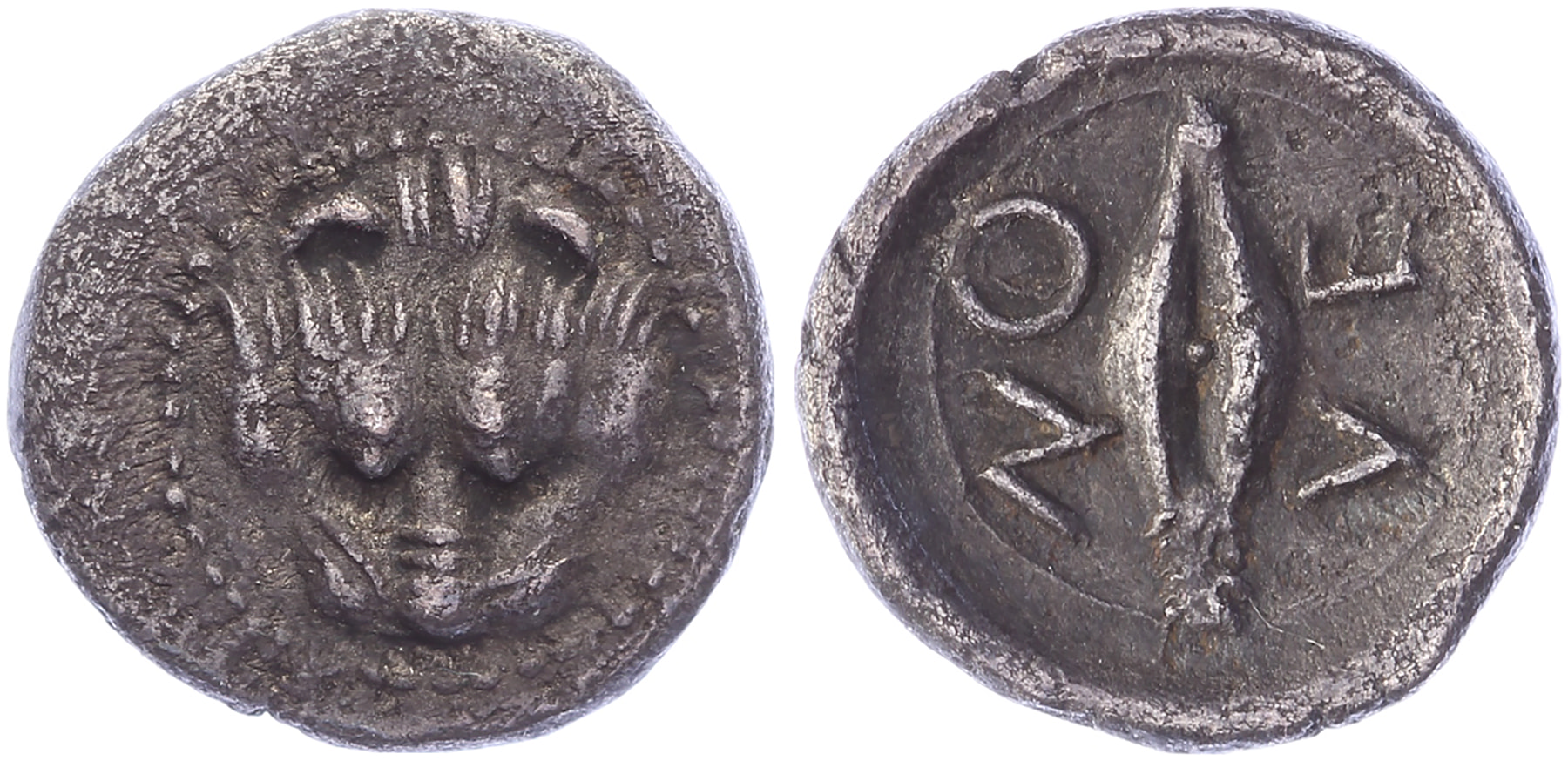 Lot (2) Circa 460-450 BC. AR Litra of Obol [0,69 gm, 10 mm]. Facing lion’s head / ΛE-ΟΝ, Grain of barley. SNG ANS 213; SNG München 546. Dark patina, minor roughness, gVF; Circa 405-402 BC, Æ Trias (Tetras) [1,72 gm, 14,4 mm]. Laureate youthful male head left; in left field, leaf / Tripod; in background lyre, at sides, two grains and in exergue, three pellets. Boehringer, AIIN 25 Suppl., pl. XIX, A17. Calciati 1; SNG ANS 270; SNG Copenhagen 361. Roughness and smoothing, VF.