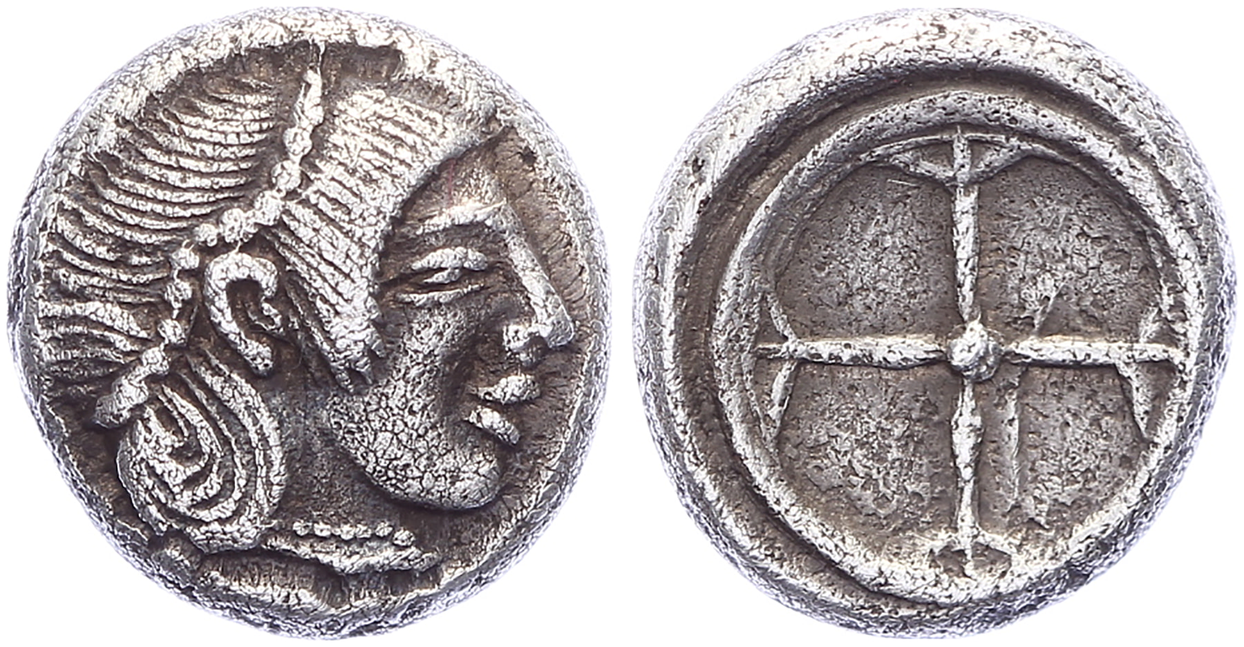 Hieron I. 478-466 BC. AR Obol [0,68 gm, 8,4 mm]. Struck circa 475-470 BC. Diademed head of Arethousa right / Wheel with four spokes. Boehringer Series XI, 286–91 or Series XIId, 362–70; HGC 2, 1371. Surfaces a bit granular as typical, nice VF.Purchased from Gijs Henzen, July 2000
