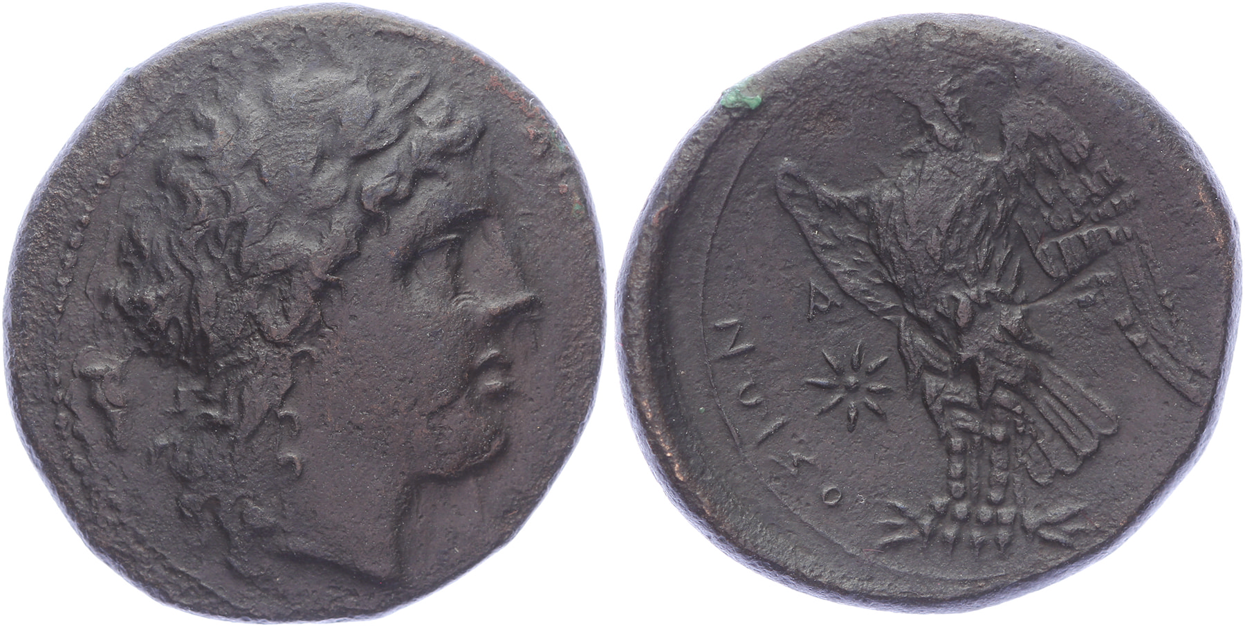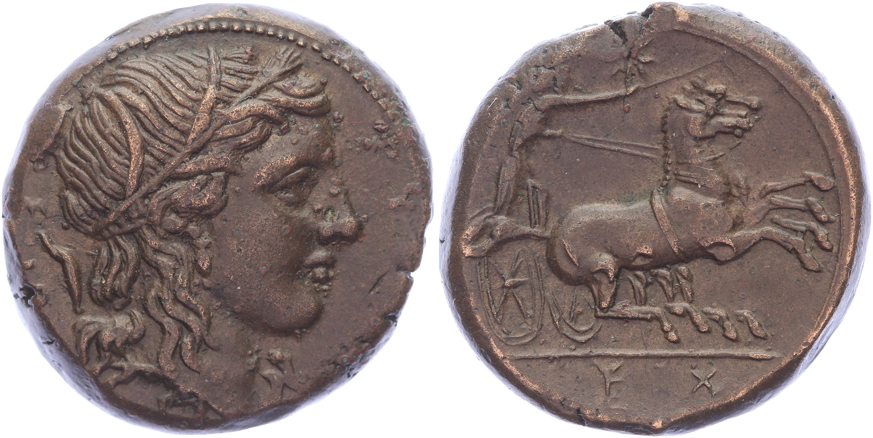 Lot (2) Hiketas II. 287-278 BC - Æ [10,49 gm, 22,6 mm]. Fourth Democracy. Head of Persephone right, a torch dolphin behind; ΣΥ[ΡΑΚΟΣΙΩ]Ν / Biga driven by Nike galloping right, a star above, E X in exergue. SNG ANS 763 (similar); Calciati 122 (obverse symbol and reverse letters not noted); SNG Copenhagen 806 var. gVF; Æ [8,65 gm, 23,2 mm]. Circa 282-278 BC. ΔΙ[ΟΣ ΕΛΛΑΝΙΟΥ], laureate head of young Zeus Hellanios right / [ΣΥΡΑΚ]-ΟΣΙΩΝ, eagle standing left on thunderbolt; to left, A above star. BAR issue 39; CNS 168 Rs 96; HGC 2, 1449. VF.
