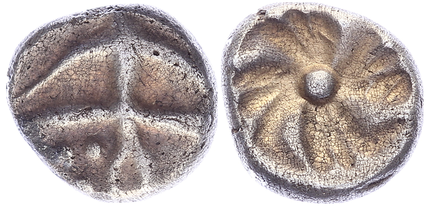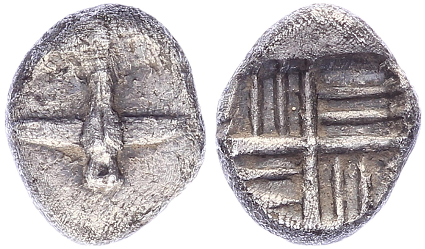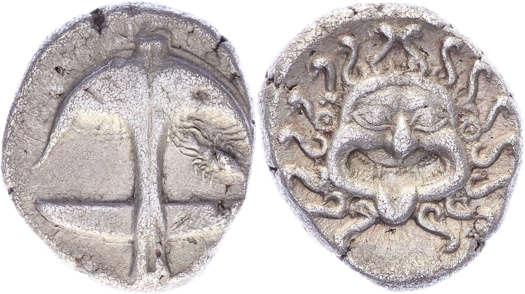Lot (3) Lot of two Hemiobols [0,56 + 0,15 gm]. Four pellets to the left of lower crossbar / whirl pattern within incuse. Unpublished in major publcations VF. & Circa 494-470 BC. Upright anchor / Swastika device in incuse. Topalov 2007, pp. 259-60, 1-3 and p. 568, 15; SNG Ruse II, 97-8; HGC 3.2, 1329. VF; AR Drachm [3,41 gm, 14,2 mm]. Facing gorgoneion / Upright anchor; crayfish to right. Topalov, Apollonia 38. Porous, VF.