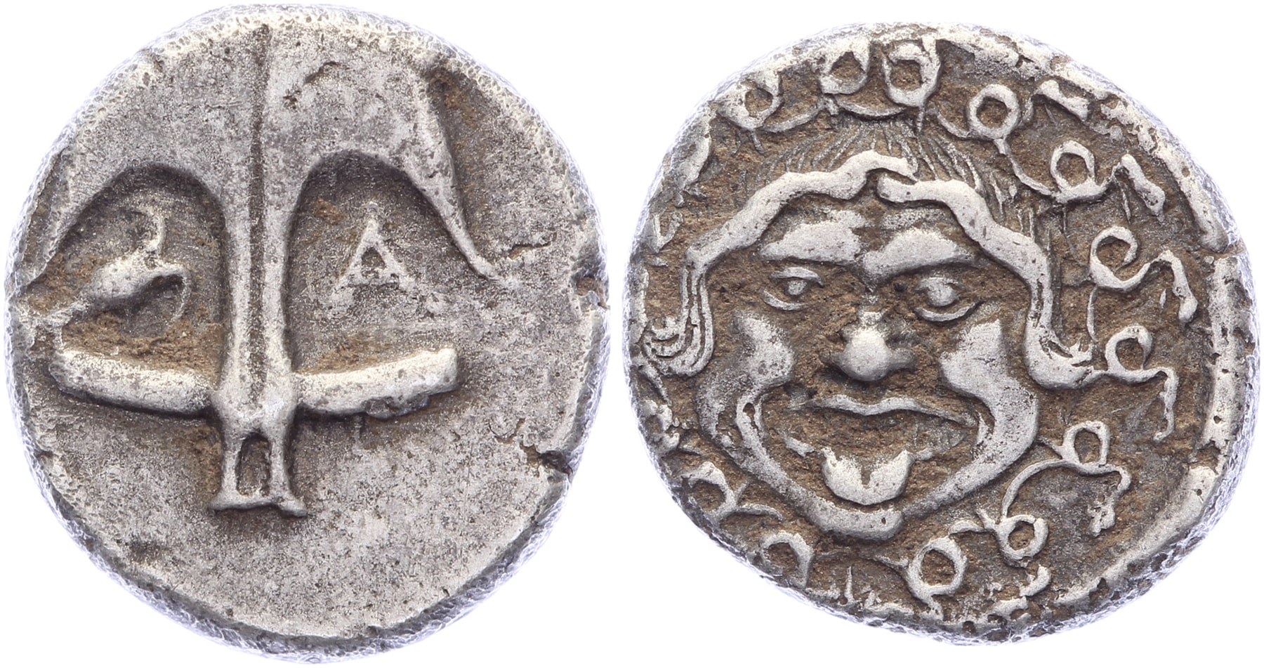 AR Drachm [3,19 gm, 13,8 mm]. Facing Gorgoneion / Upright anchor; A and crayfish flanking. SNG BM Black Sea 157. Deposits, VF.