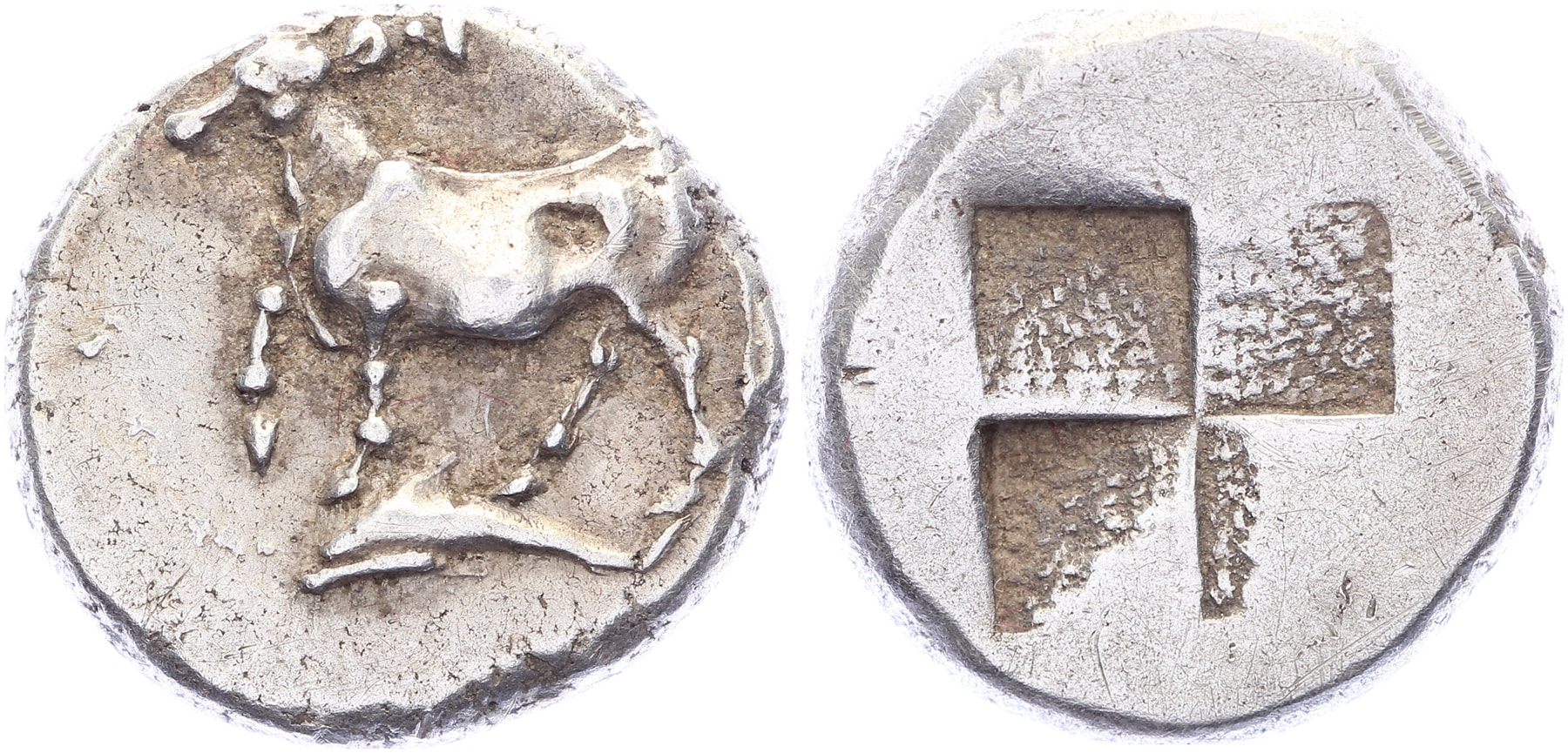 Circa 340-320 BC. AR Siglos [5,39 gm, 17 mm]. ΠY, bull standing left on dolphin left, right foreleg raised / Quadripartite incuse square of mill sail pattern. HGC 3.2, 1389. SNG BM Black Sea 21. SNG Copenhagen 475-7. Nice VF.Purchased from Tom Vossen, November 2002 (Tienen coin fair)