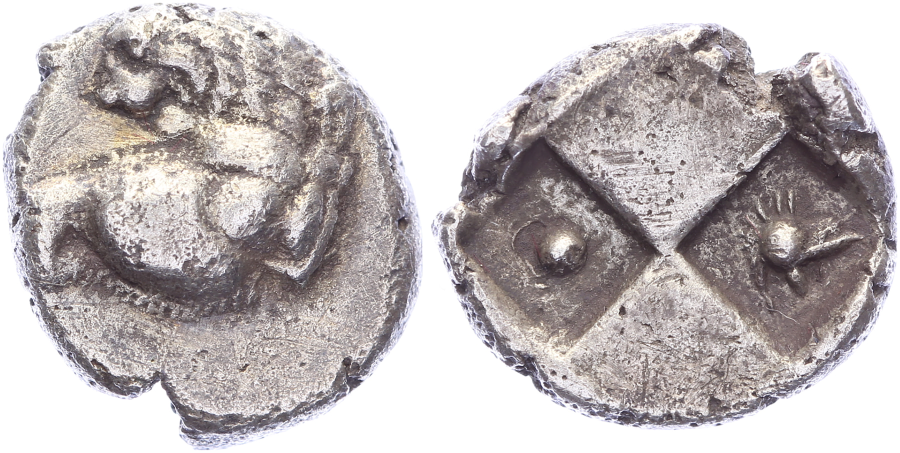 Circa 386-338 BC. AR Hemidrachm [2,17 gm, 12 mm]. Forepart of lion right, head reverted / Quadripartite incuse square; two opposing quarters raised, the others containing pellet and crested helmet. SNG Berry 502. Harshly cleaned, VF.Purchased from Tom Vossen, November 2002 beurs (Tienen coin fair)