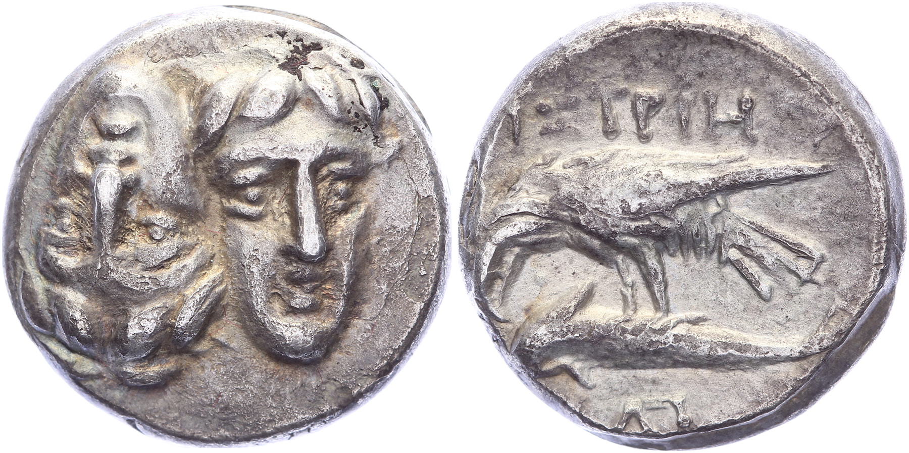 400-350 BC. AR Drachm [6,60 gm, 17,9 mm]. Two young male heads facing (the Dioscuri?), side by side, one upright, the other inverted / IΣTPIH, sea-eagle left attacking dolphin; monogram below dolphin. traité-  -  BMC -:  GC 1669 var.; SNG Copenhagen 196 var. ; AMNG. 1/147. VF.Purchased from F. Javorṡeck, February 1996 (The Hague Coin Fair)