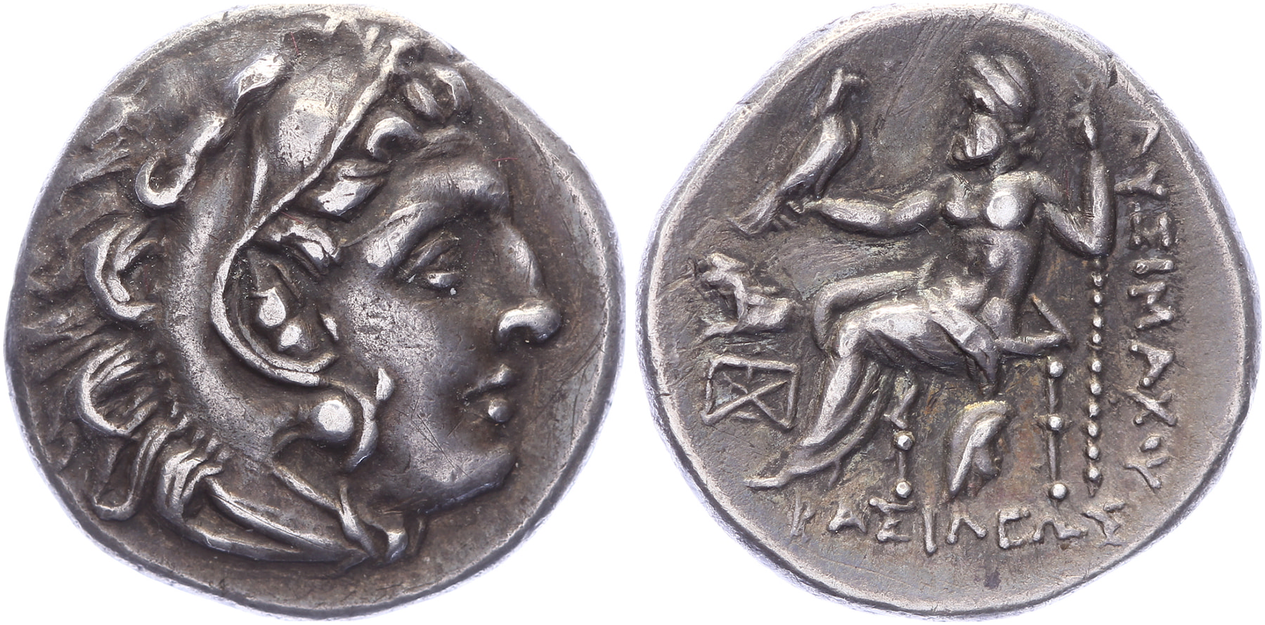 305-281 BC. AR Drachm [4,22 gm, 17,3 mm]. Abydos mint. Struck circa 299/8-297/6 BC. Head of Herakles right, wearing lion skin / ΒΑΣΙΛΕΩΣ / ΛΥΣΙΜΑΧΟΥ, Zeus Aëtophoros seated left; in left field, lion forepart left above monogram; below throne, head right wearing Phrygian cap. Thompson 66 var. (symbol below throne); Price L17. Some cleaning marks, toned gVF.