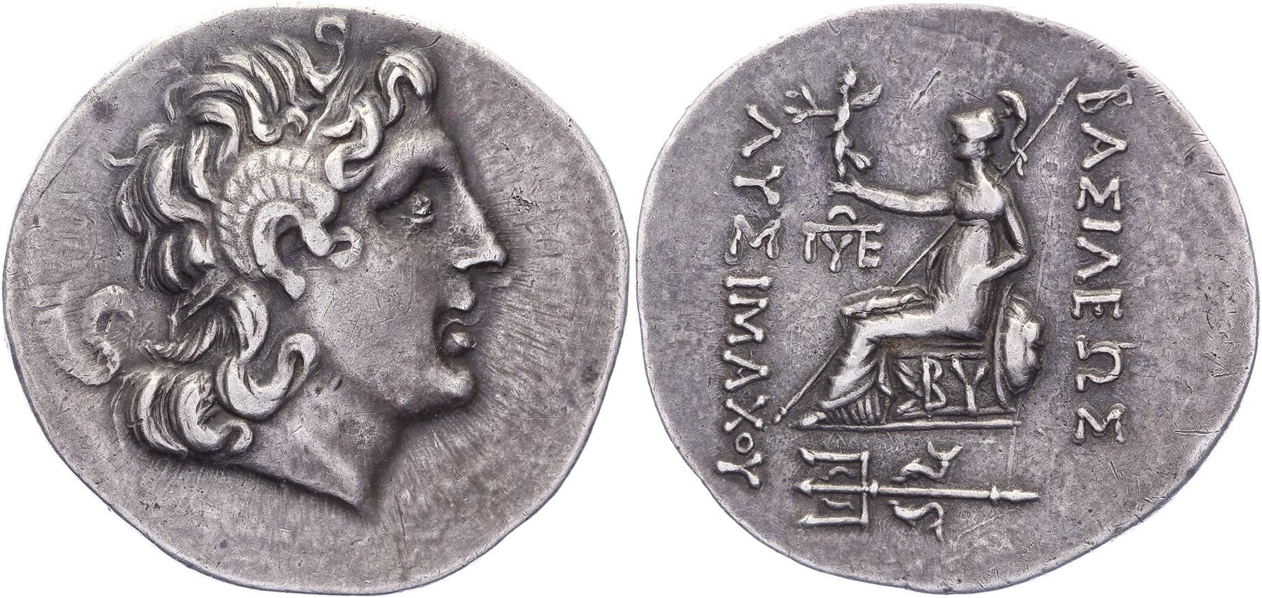 305-281 BC. AR Tetradrachm [16,79 gm, 36,5 mm]. Byzantion mint. Struck circa 110-101 BC. Head of deified Alexander right, with horn of Ammon / BAΣΙΛΕΩΣ - ΛΥΣIMAXOY, Athena seated left, holding Nike, left elbow resting on her shield, spear behind; monogram above knee, BY on throne, trident in exergue. Arslan-Lightfoot 729 (same obverse die); Müller 166. Toned gVF.Purchased from Jean Elsen Auction 98 lot 1545