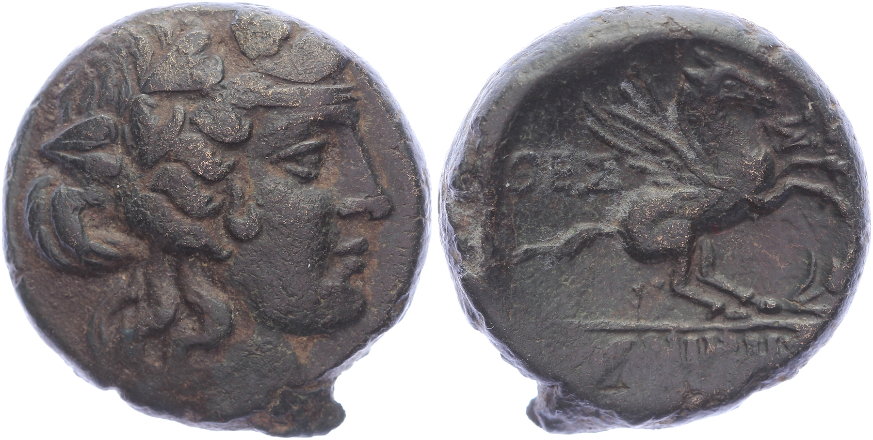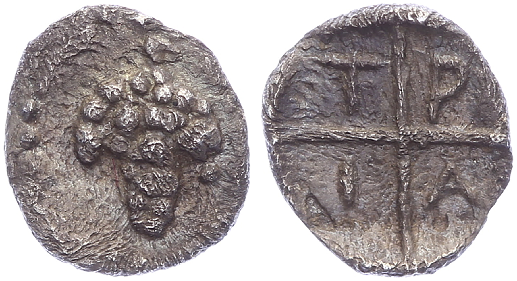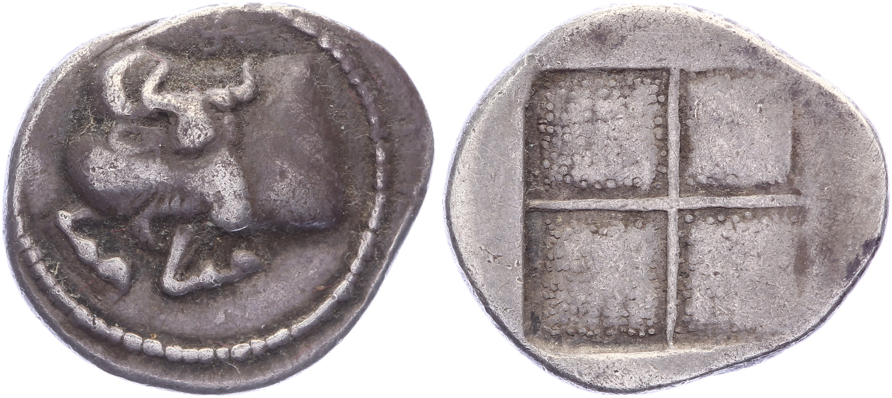 Lot (4) Circa 470-390 BC. AR Tetrobol [2,24 gm, 15,7 mm]. Forepart of bull to left, his head turned back to right; above, swastika / Quadripartite incuse square. HGC 3.1, 392. SNG ANS 39-41. Toned aVF; Circa 400-358 BC. Æ [3,79 gm, 13,9 mm]. Helmeted head of Athena left / Wheel with four spokes with ethnic between spokes. AMNG III/2, 45; HGC 3, 397. Sandy deposits, aVF.Toegevoegd: Thessalonika - Circa 187-168/7 BC. Æ [7,85 gm, 20,5 mm]. Wreathed head of Dionysos right / ΘΕΣ / ΣΑΛΟΝΙΚHΣ, Pegasos leaping right; grain ear below. Touratsoglou, Macedonia 3; HGC 3, 724. VF.; Tragilos - Circa 450-410 BC. AR Hemiobol [0,16 gm, 7 mm]. Barley ear within dotted border / T-P-I-A within quadripartite incuse square. AMNG III.2, 2; SNG ANS 903 var. (ethnic arrangement); HGC 3.1, 745. Minor roughness, toned VF.